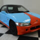 This 1992 Honda Beat is painted in a Gulf livery style with light blue and orange paint and black interior. The car features a E07A MTREC three-cylinder mated to a five-speed manual transmission. The engine sits in the middle of the car powering both rear wheels. The sporty Beat produces 63 hp from the factory at 8100rpm. It also features staggered 13″ and 14″ Mugen CF48 wheels and a modified exhaust.