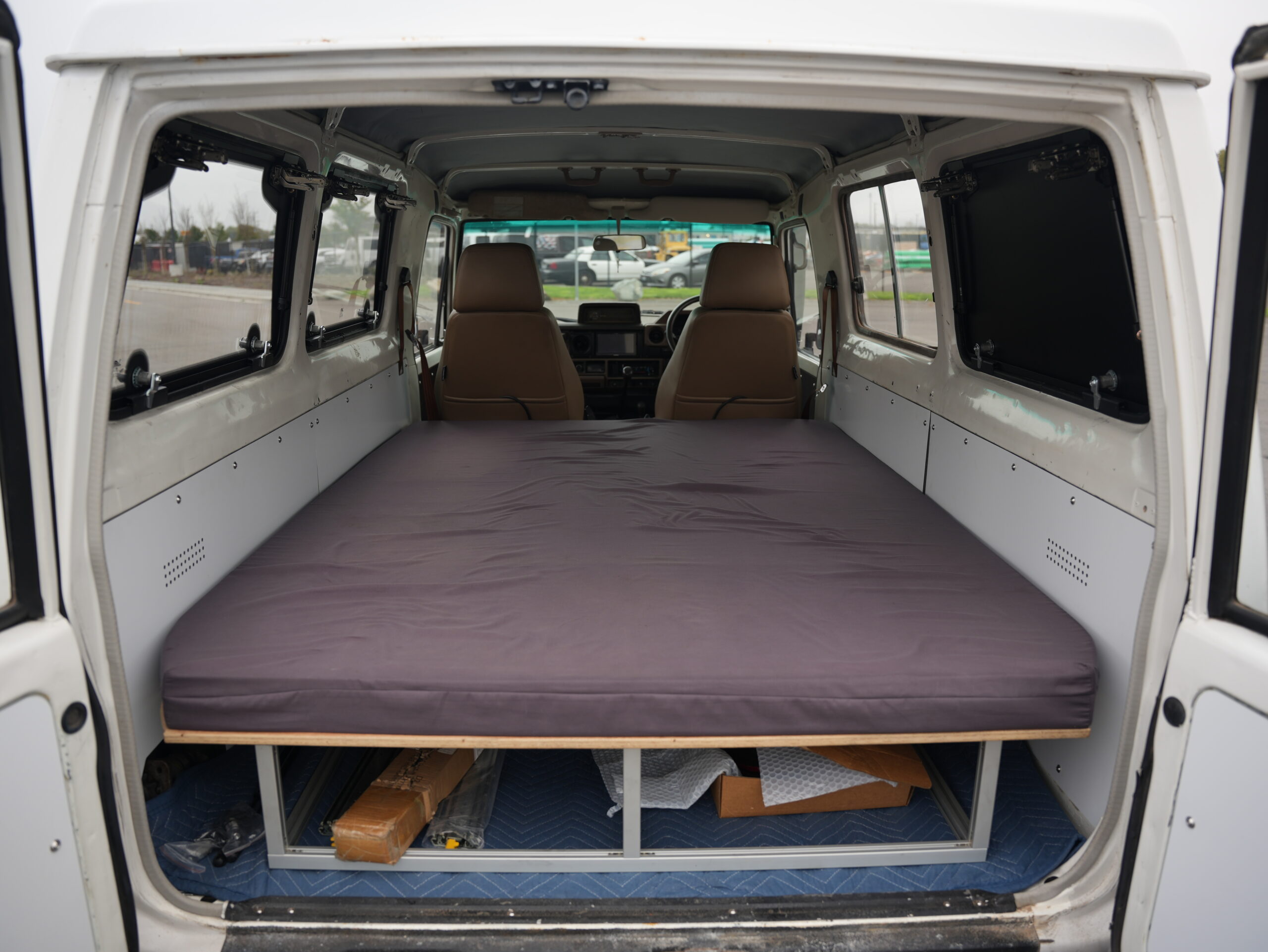 The rear seats were replaced with a raised sleeping platform with storage below a 3″ memory foam bed. The raised aluminum frame is the perfect place for custom pullout drawers or your oversized outdoor gear.