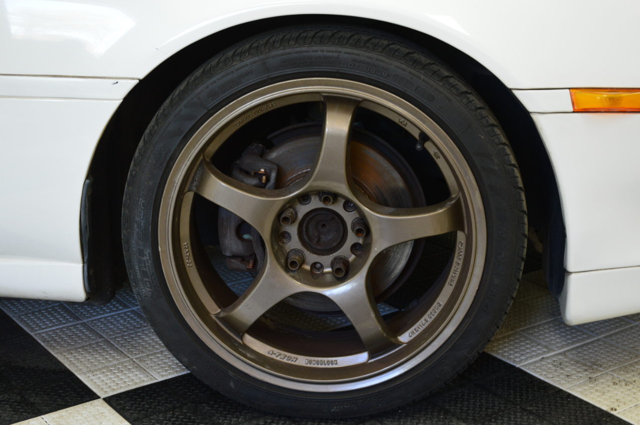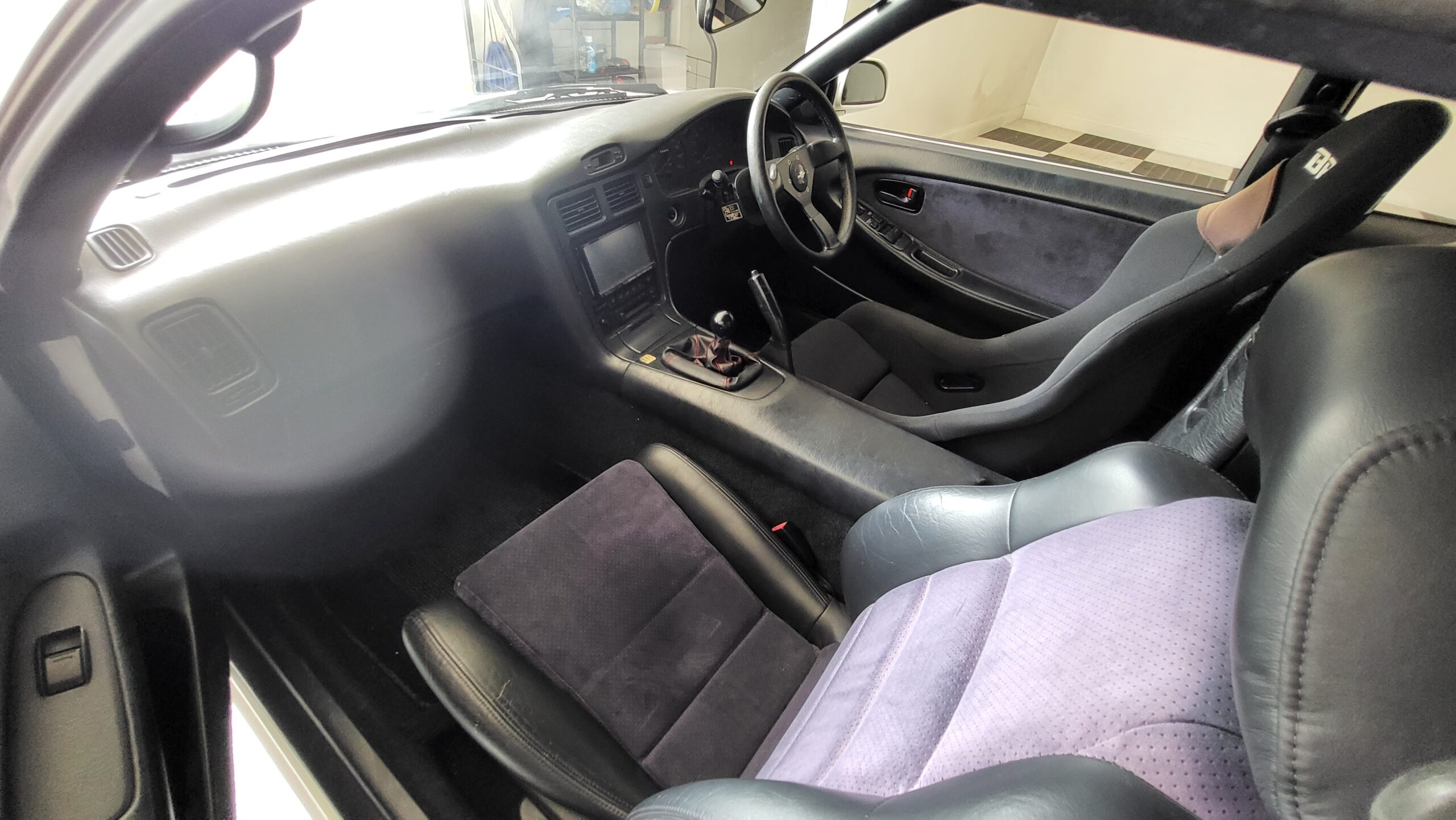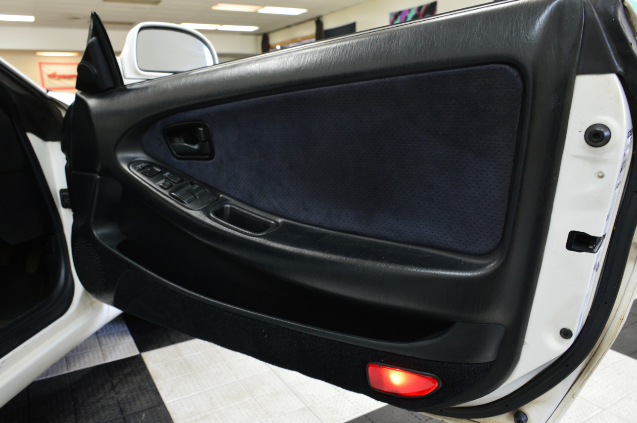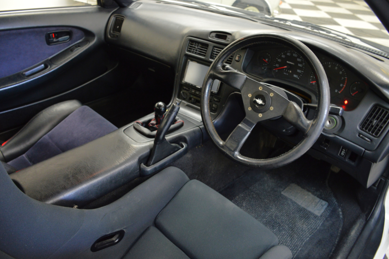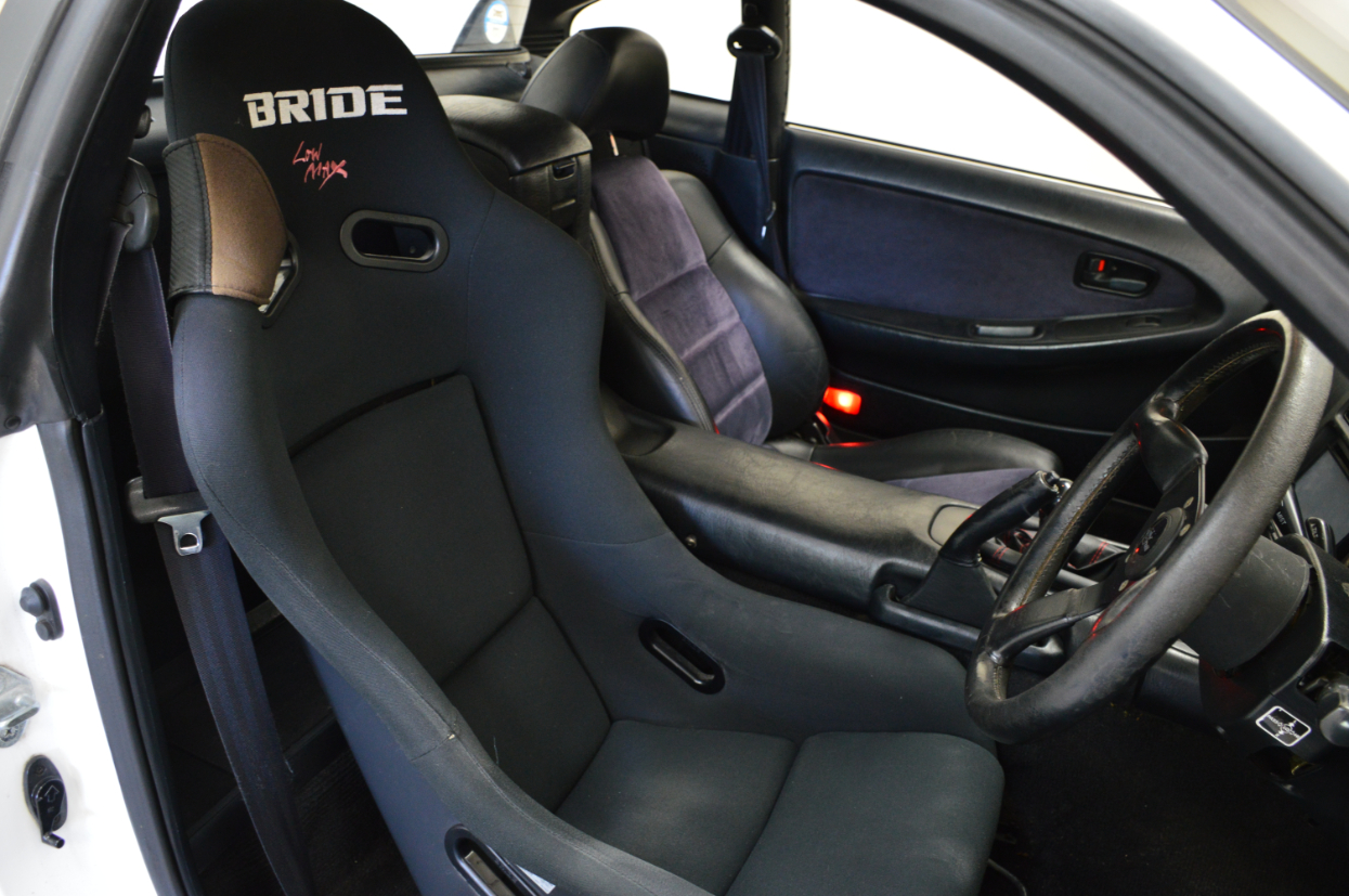 This MR2 GT Turbo has a Super White exterior and black interior, a stock turbocharged 2.0L 3S-GTE engine with 242hp, and a stock exhaust. This MR2 is spec’d out from the factory with a 5 speed manual transmission, electric folding mirrors, steering fog lamps and a rear spoiler. It has a Kenwood touchscreen head unit, short shifter, 17″ A-Tech Monoblock wheels, welded differential, a Personal brand steering wheel, and Ohlins dampers fitted.
