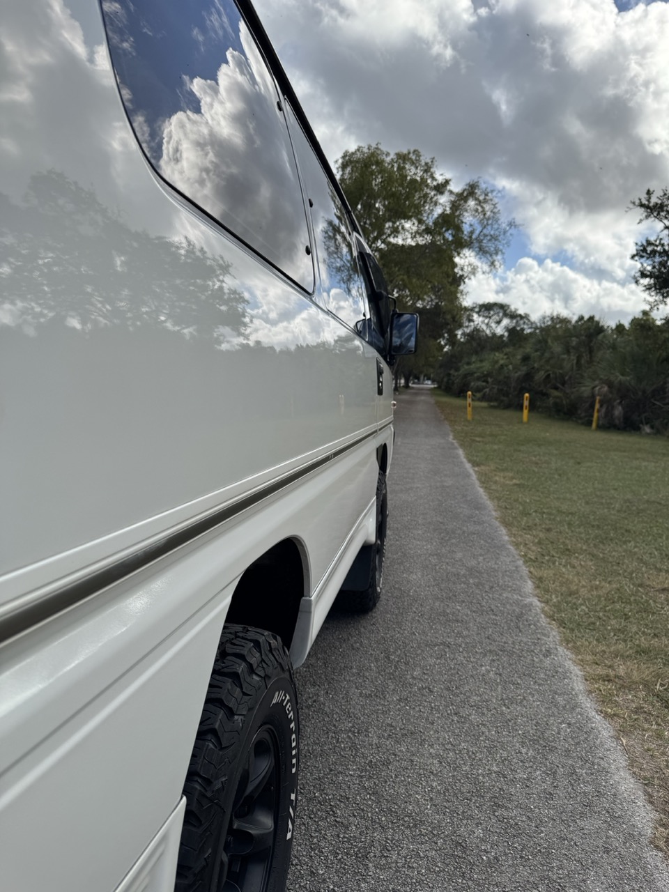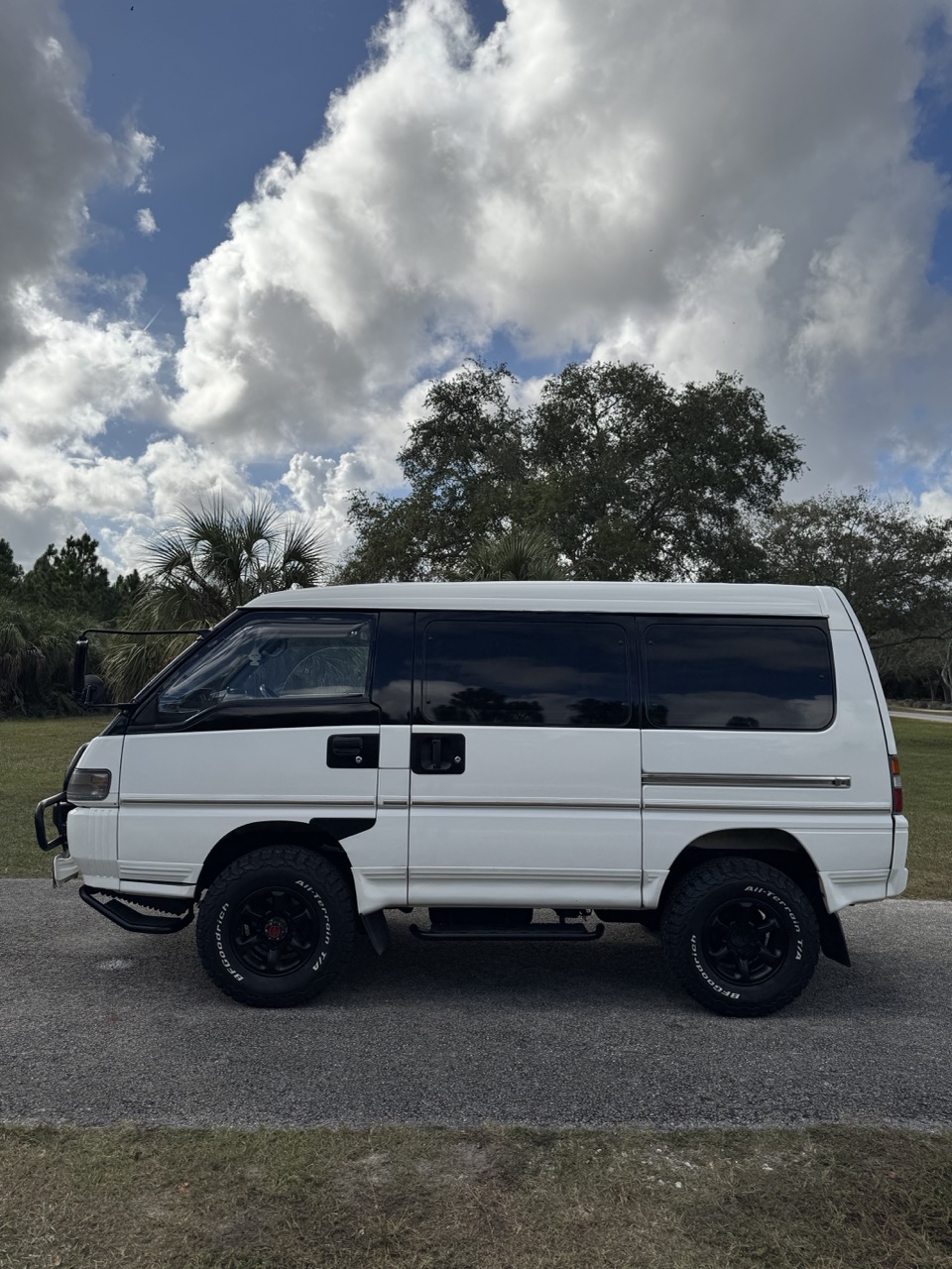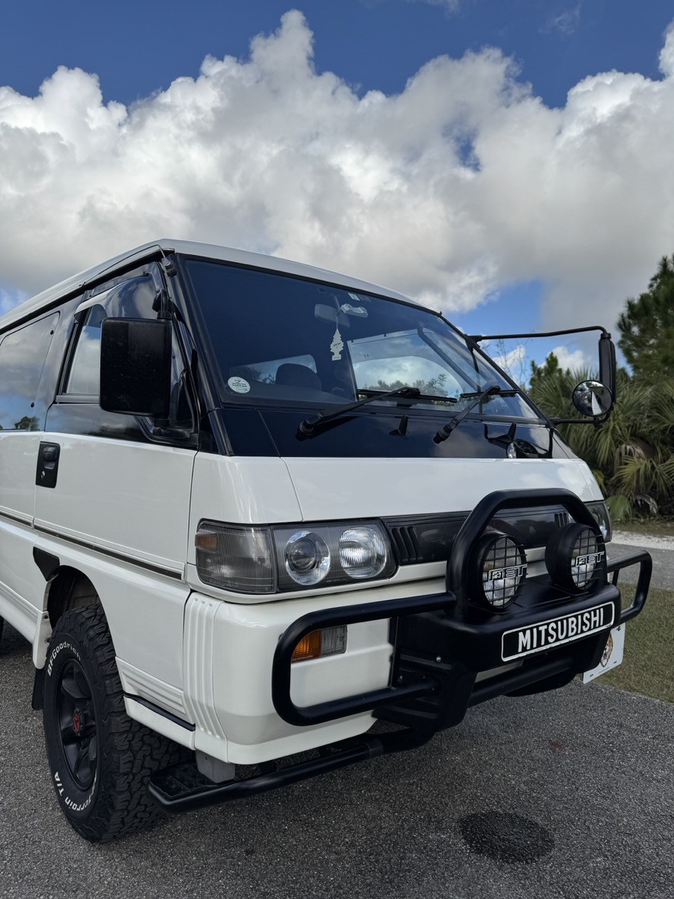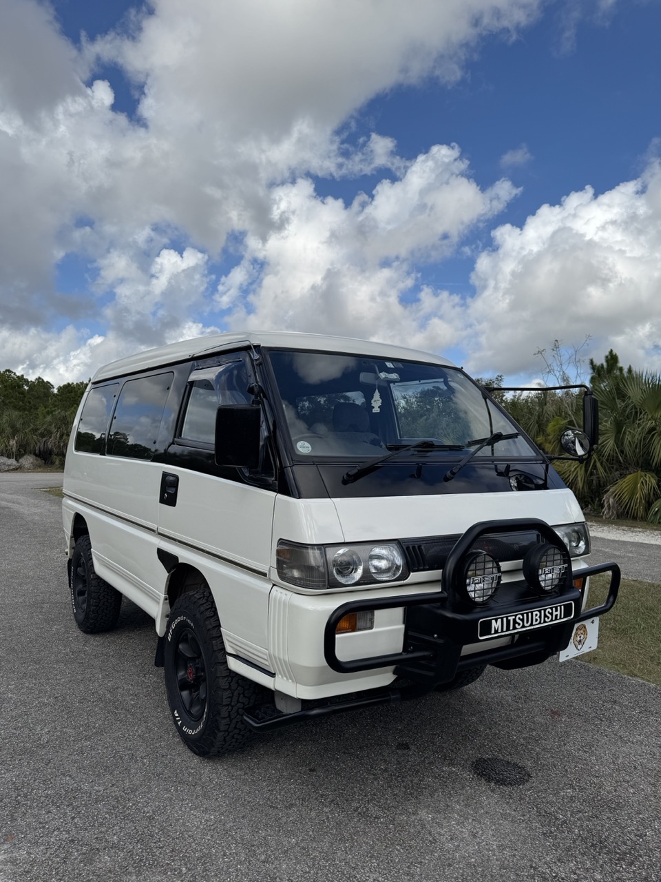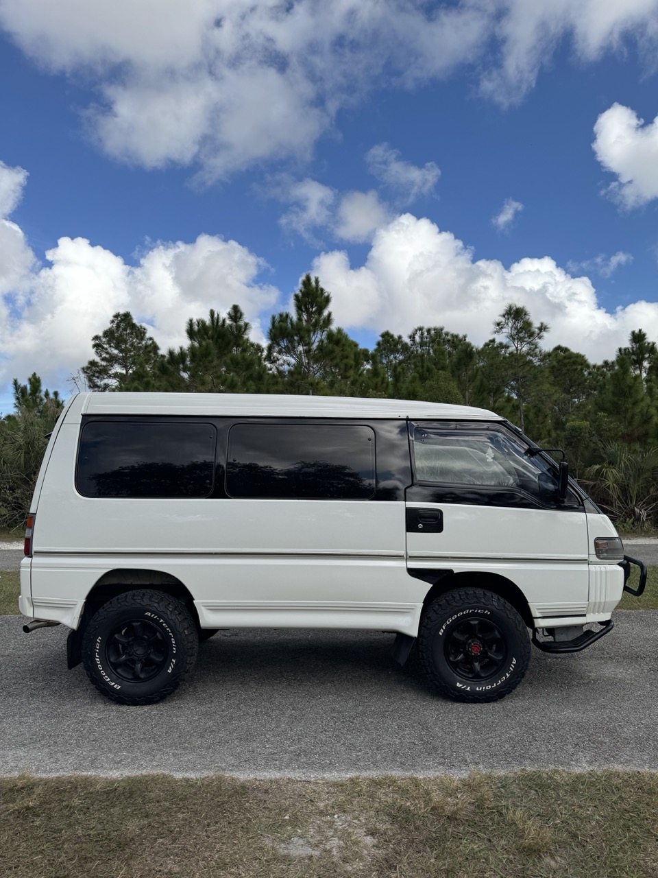 This Delica has been thoughtfully upgraded with a 2-inch suspension lift and new shock absorbers, improving both ground clearance and ride control over rough surfaces. It now rides on a set of BFGoodrich KO2 Baja Champion All-Terrain tires mounted on aggressive black 15-inch aftermarket wheels. These tires are approximately 3.5–4 inches taller than the factory tire size, dramatically improving approach angles, obstacle clearance, and overall trail presence. The KO2s are renowned for their unmatched versatility—designed to perform exceptionally well on pavement with quiet highway manners, while delivering outstanding grip off-road in mud, snow, sand, loose dirt, and rocky terrain. This dual-purpose performance makes them ideal for drivers who want a single tire capable of handling both daily road use and demanding off-grid adventures with confidence.
