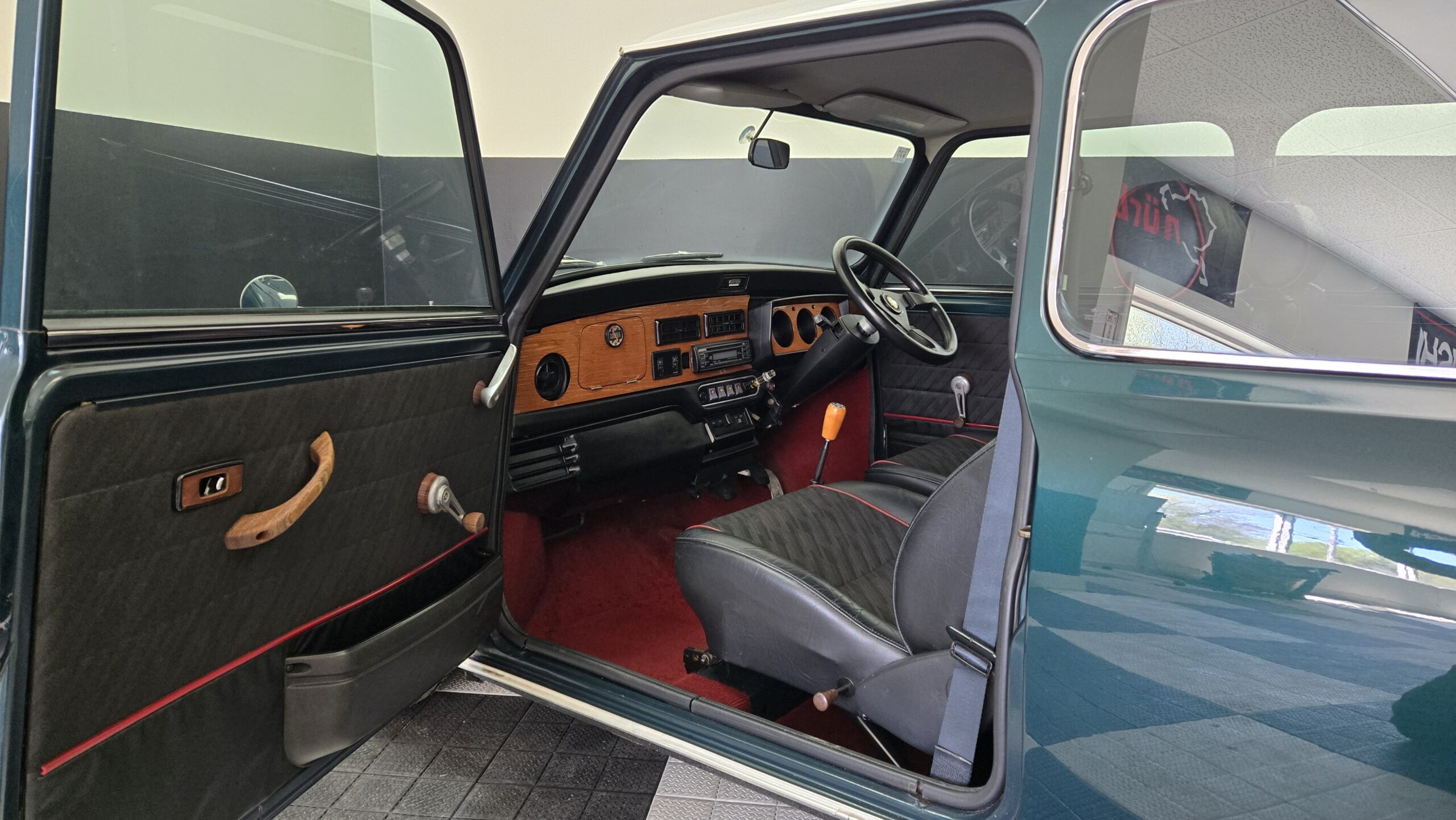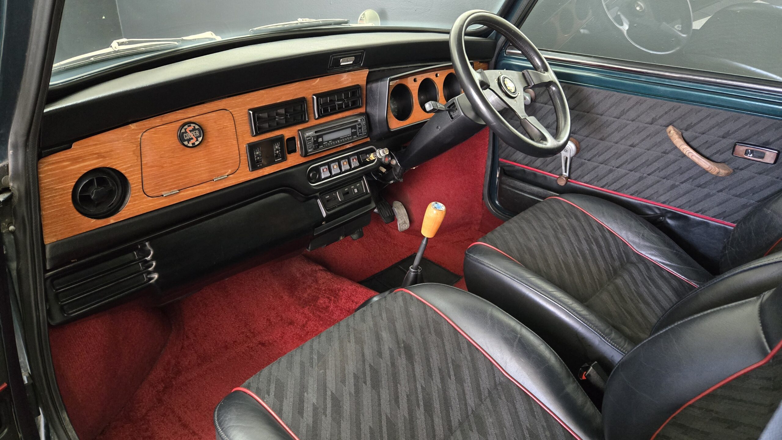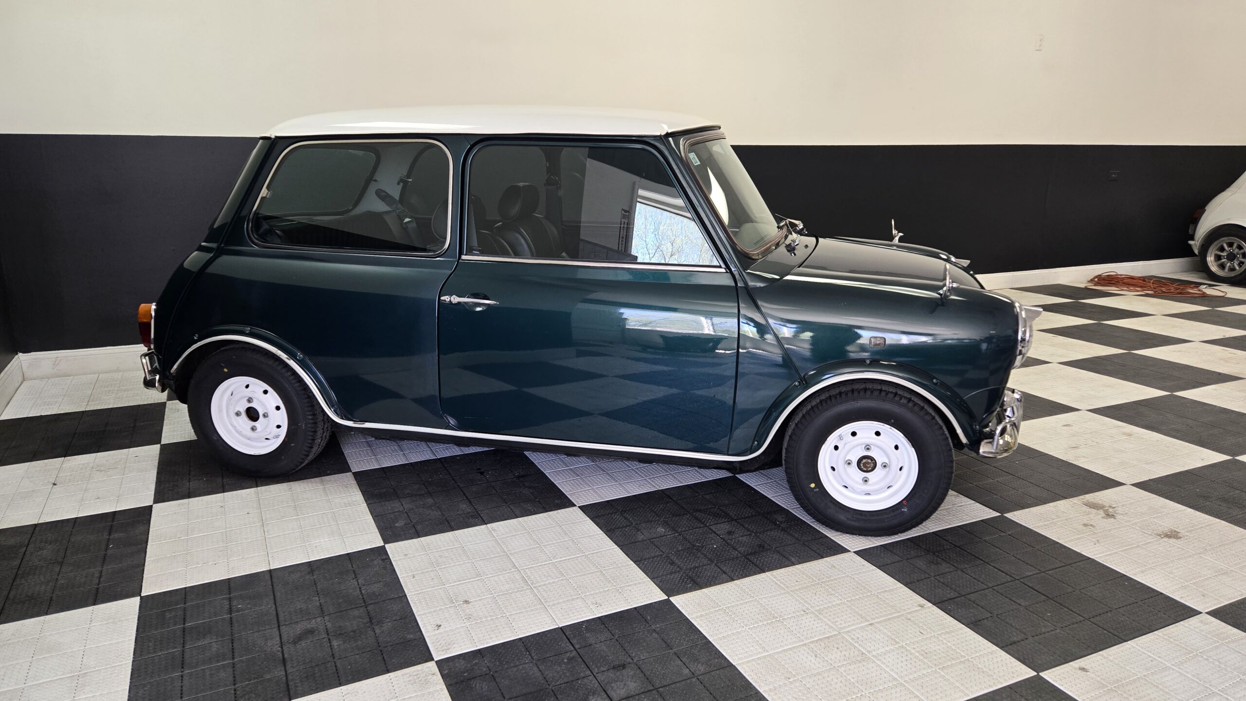 This 1994 Rover Mini Cooper is painted green with a white roof and a black interior and red carpet. The car has a 1.3-liter 4-cylinder engine, backed by a 4-speed manual transmission. It has classic-style 10″ wheels, classic MK2 grille, taillights, reverse light, badging. The car features air conditioning and a aftermarket vintage momo steering wheel.