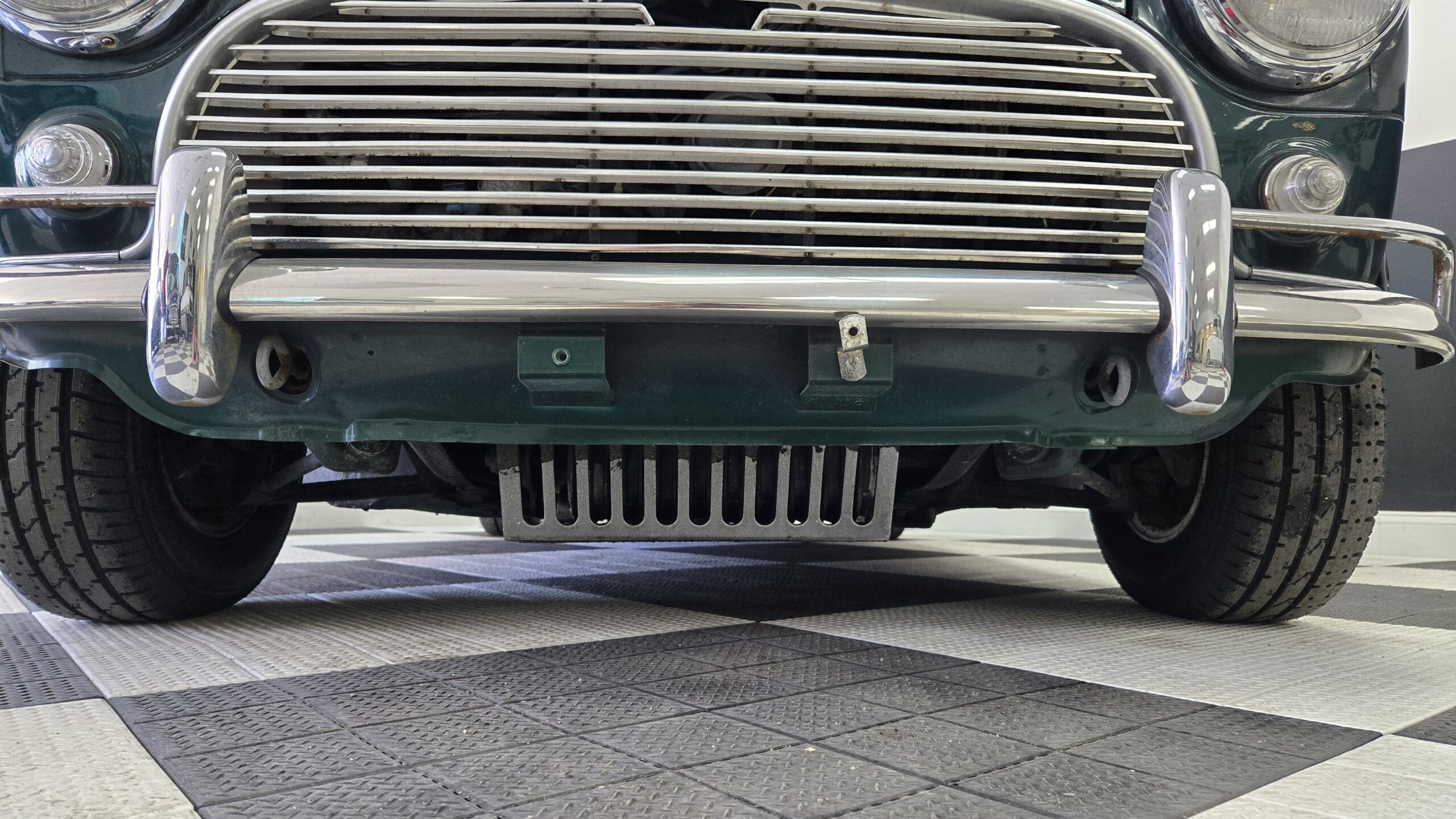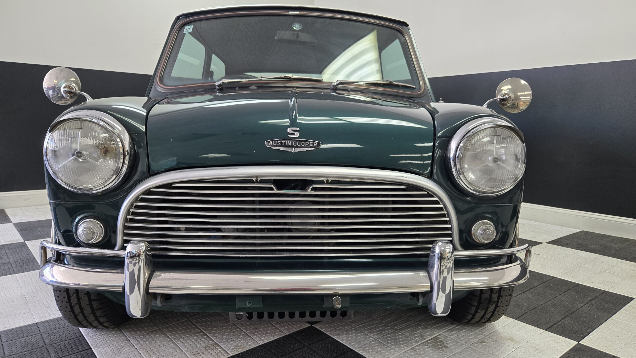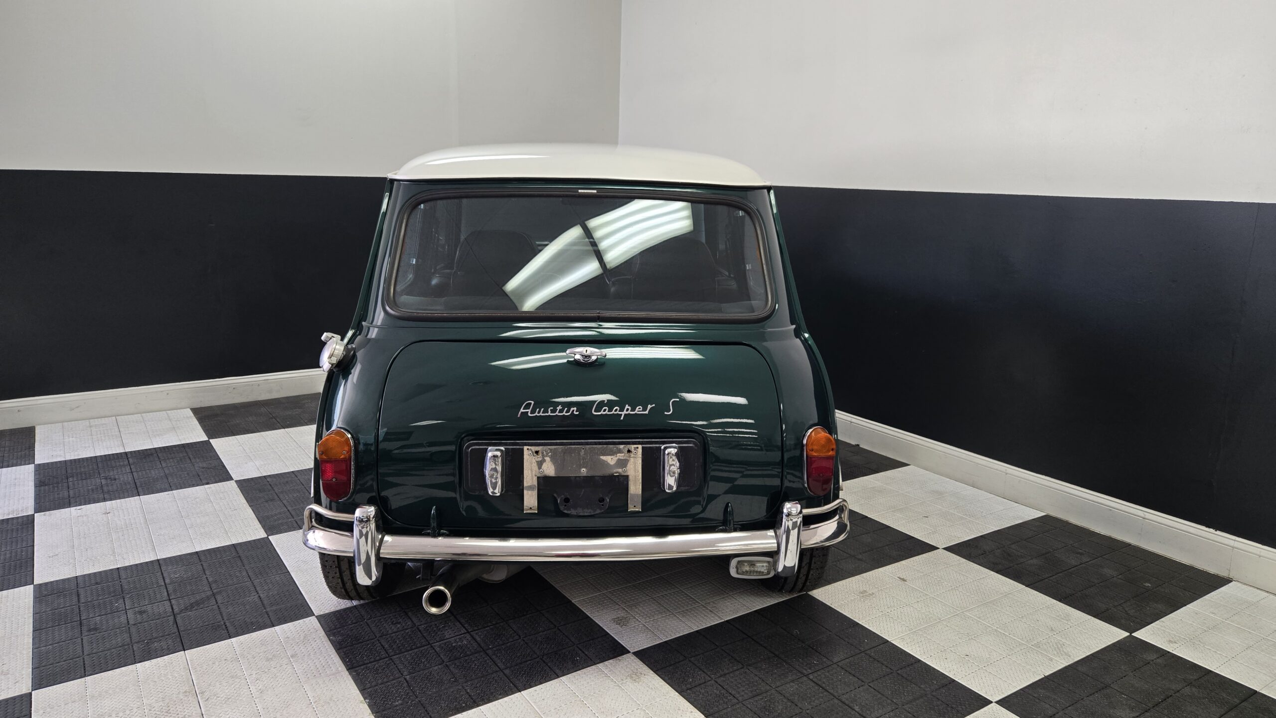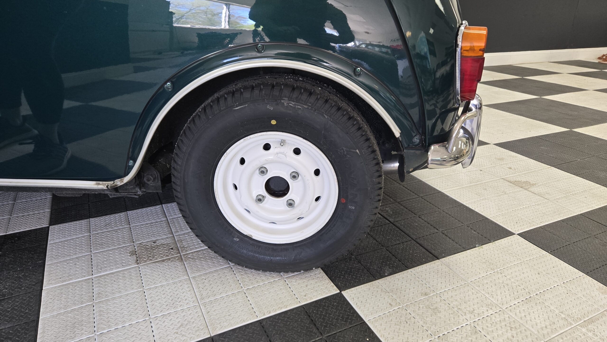 This 1994 Rover Mini Cooper is painted green with a white roof and a black interior and red carpet. The car has a 1.3-liter 4-cylinder engine, backed by a 4-speed manual transmission. It has classic-style 10″ wheels, classic MK2 grille, taillights, reverse light, badging. The car features air conditioning and a aftermarket vintage momo steering wheel.
