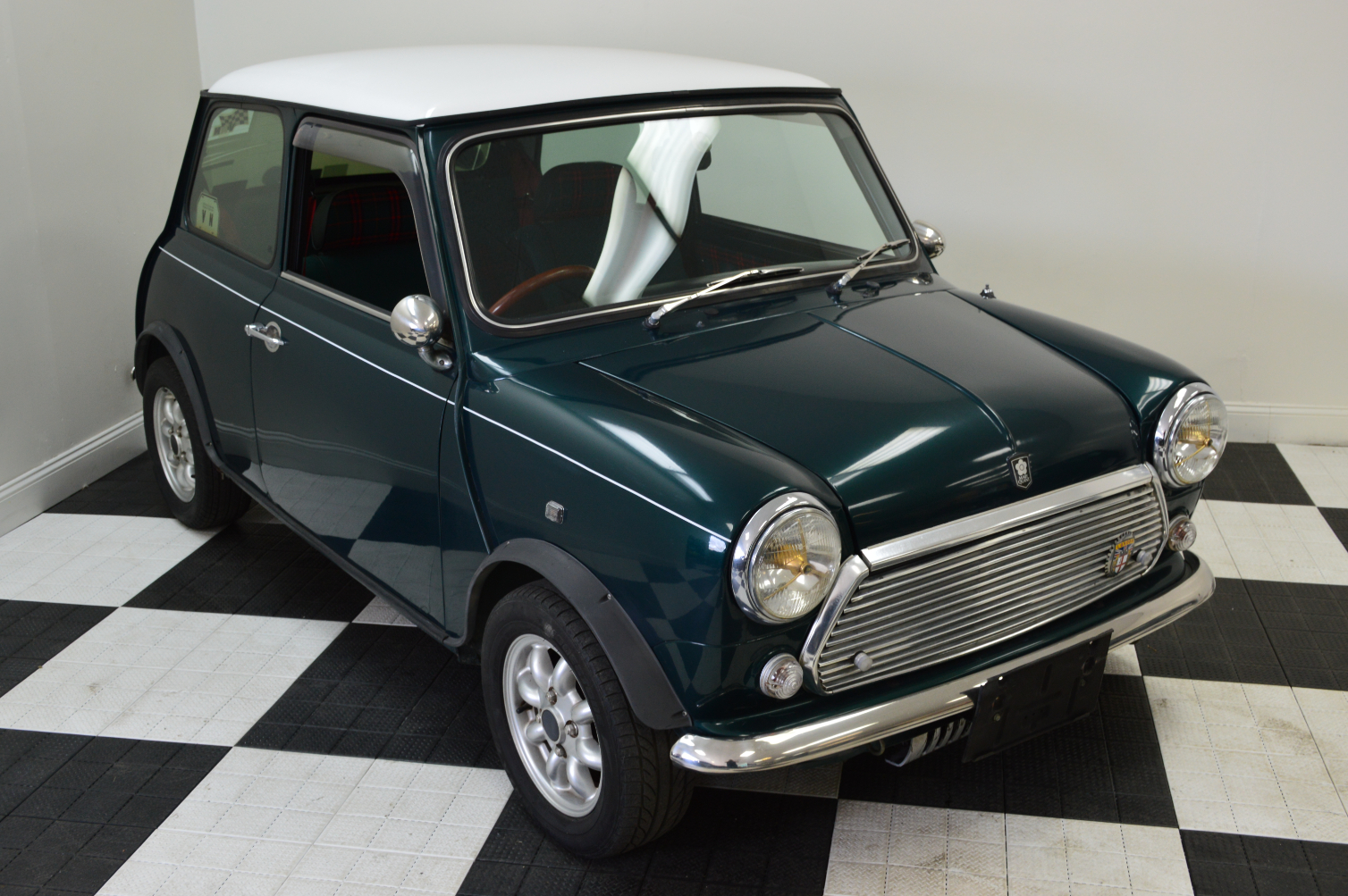 This 1996 35th Anniversary Rover Mini is painted in British Racing Green with a white roof and Green & Red Tartan interior with Red seatbelts. The car features color-matched fender flares, factory mini-lite style wheels, and clear front turn signal lenses. This mini has a 1.3 liter 4 cylinder fuel-injected engine with air conditioning. The engine is backed by a 4 speed automatic transmission and is equipped with a Delta Power exhaust.