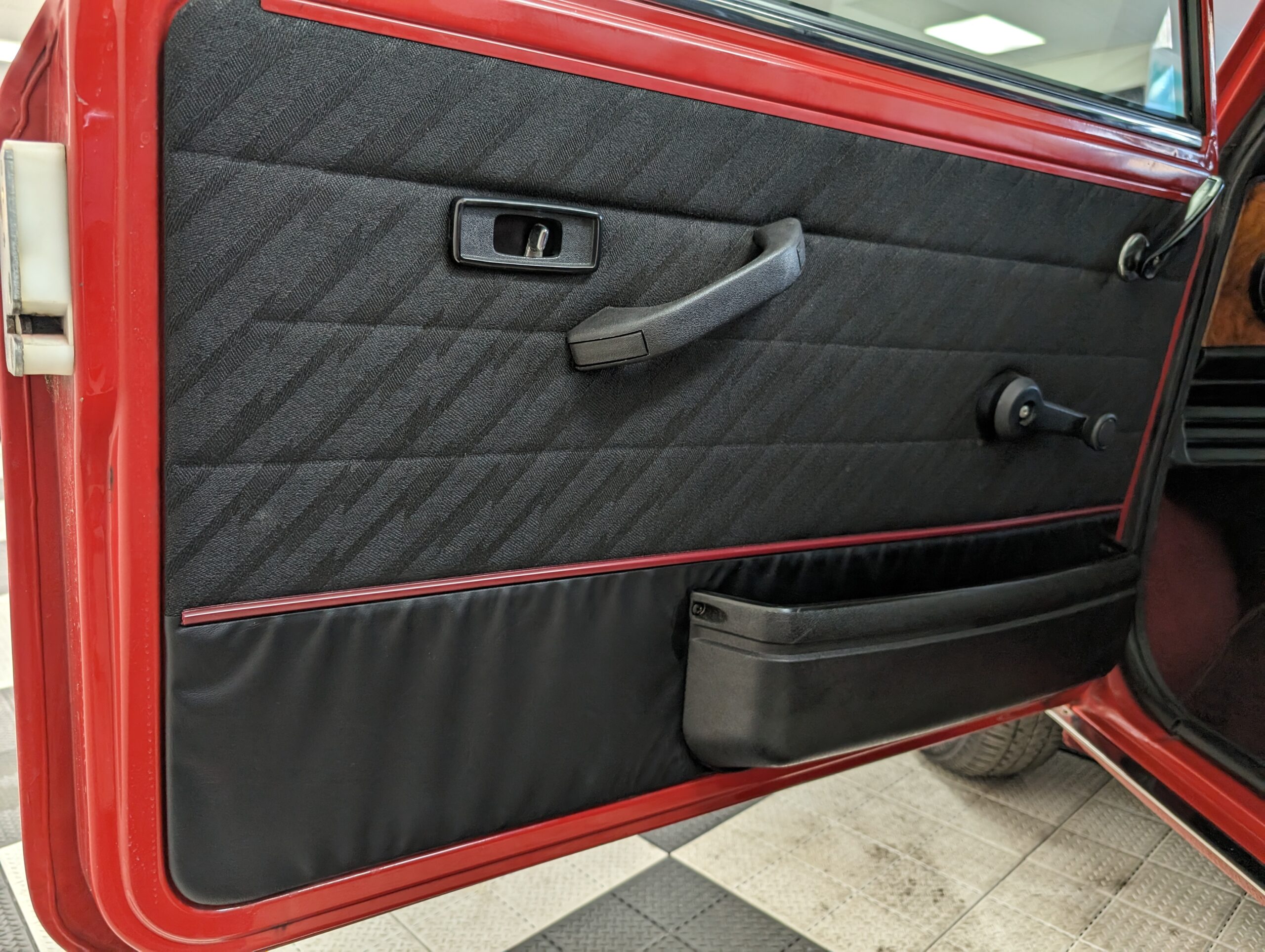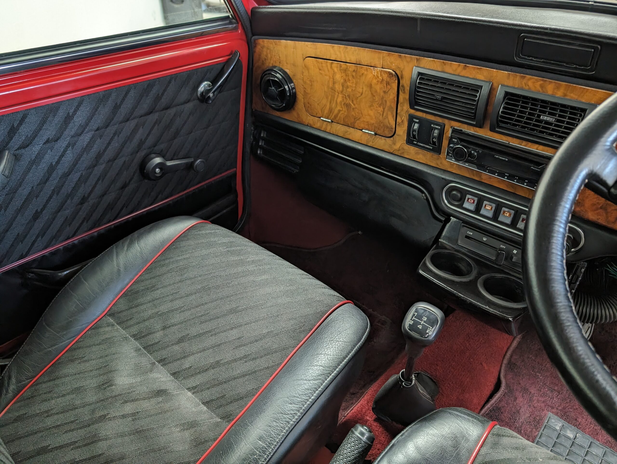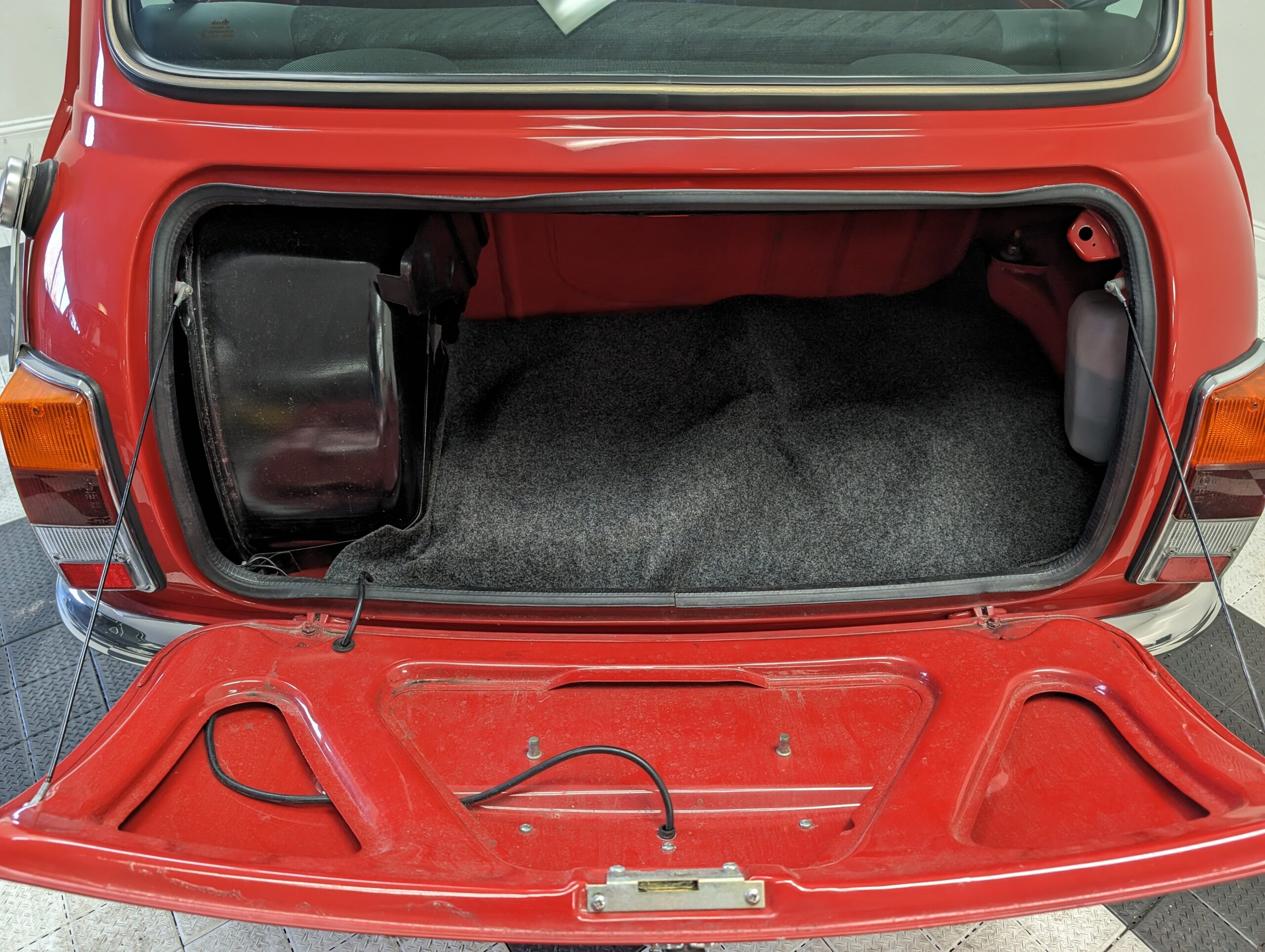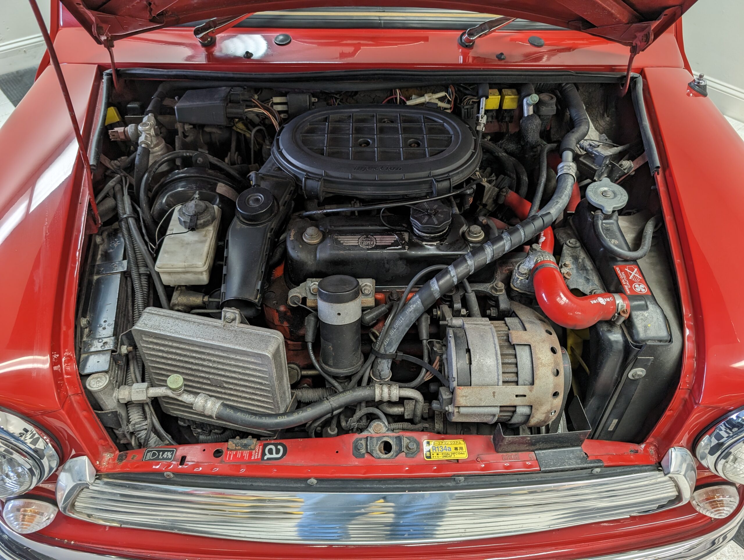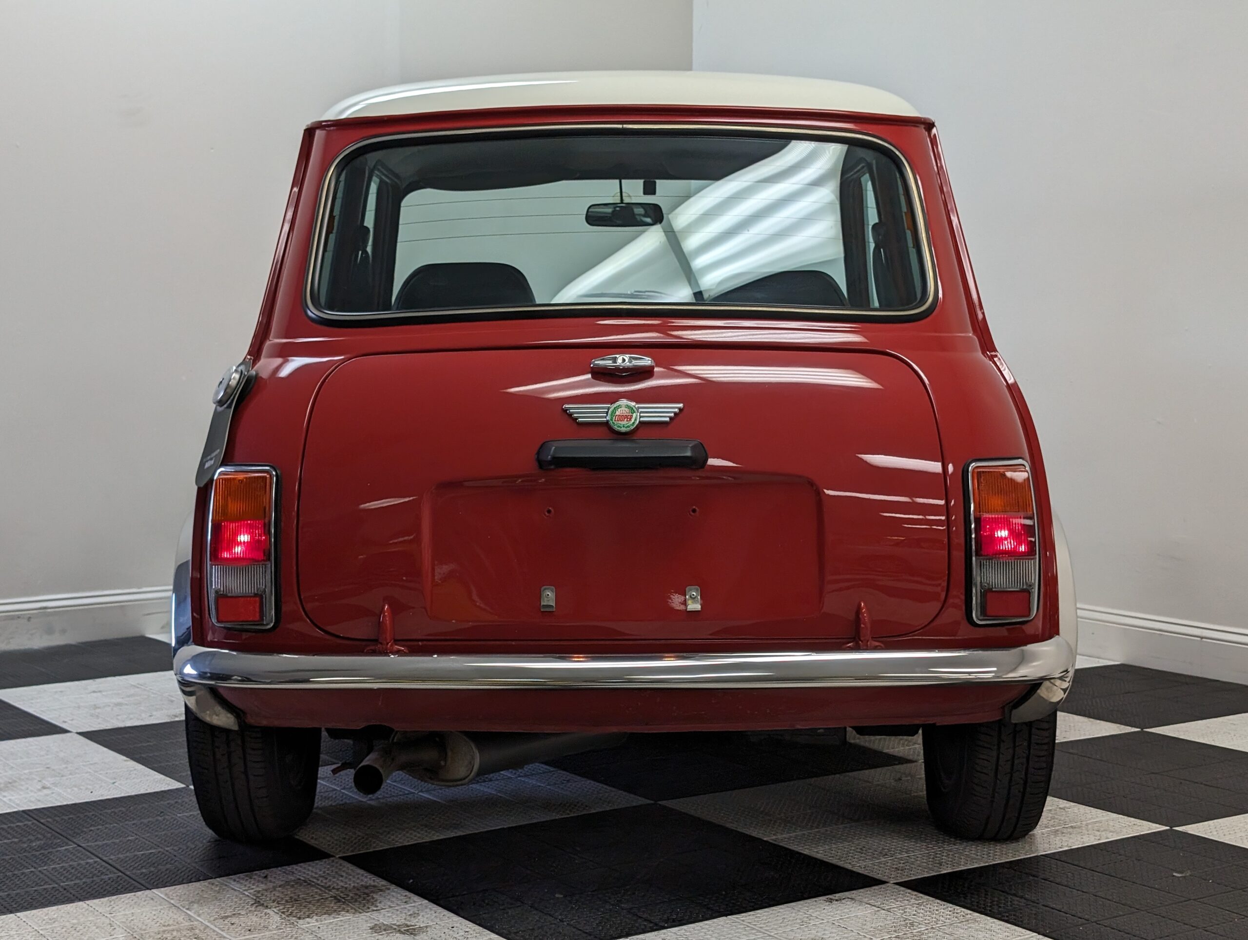 This 1995 Rover Mini is painted in red with a white roof and a black leather/cloth interior. The car features chrome fender flares. This mini has a 1.3-liter 4-cylinder fuel-injected engine with air conditioning. The engine is backed by a 4-speed manual transmission and is equipped with an aftermarket head unit.