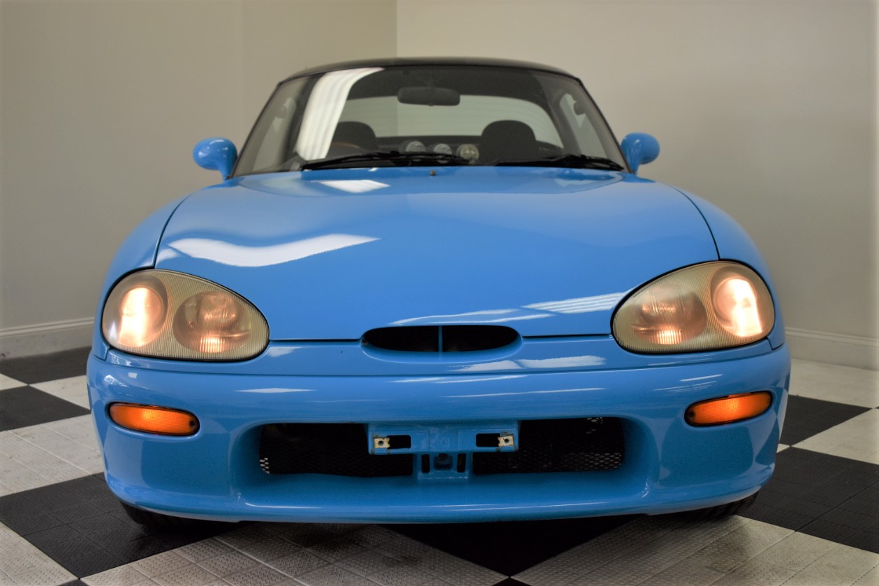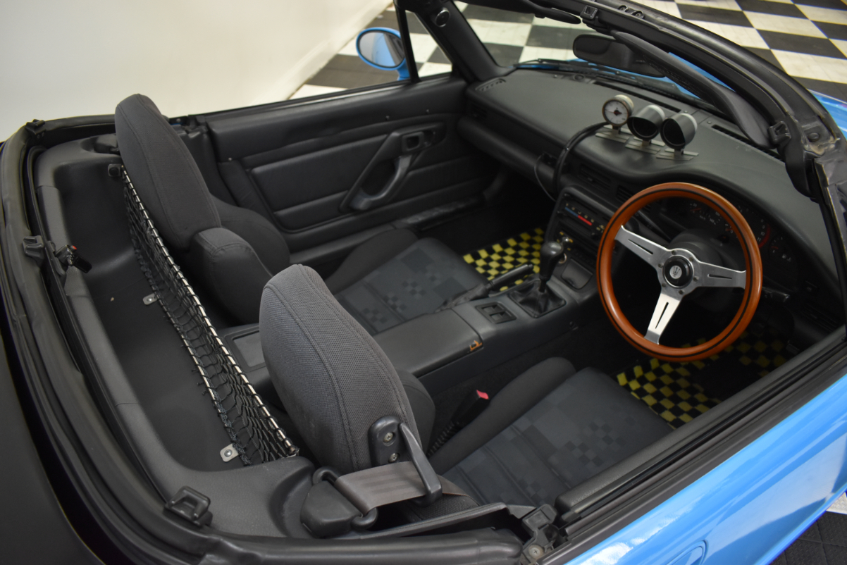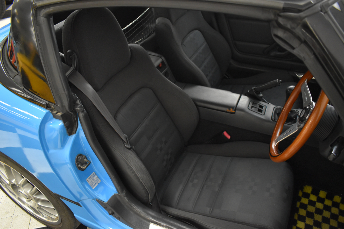 This 1993 Suzuki Cappuccino is painted in light blue with black/grey interior. The car has a K6A inline three-cylinder turbo mated to a five-speed manual transmission. It is running on 15″ SSR wheels, KYB New SR Special Shocks/Struts & Springs, aftermarket mandrel-bent Fujitsubo Exhaust, and has a Pioneer Carrozeria head unit. Cappuccinos have a removable hard top and T-tops/Targa panels.