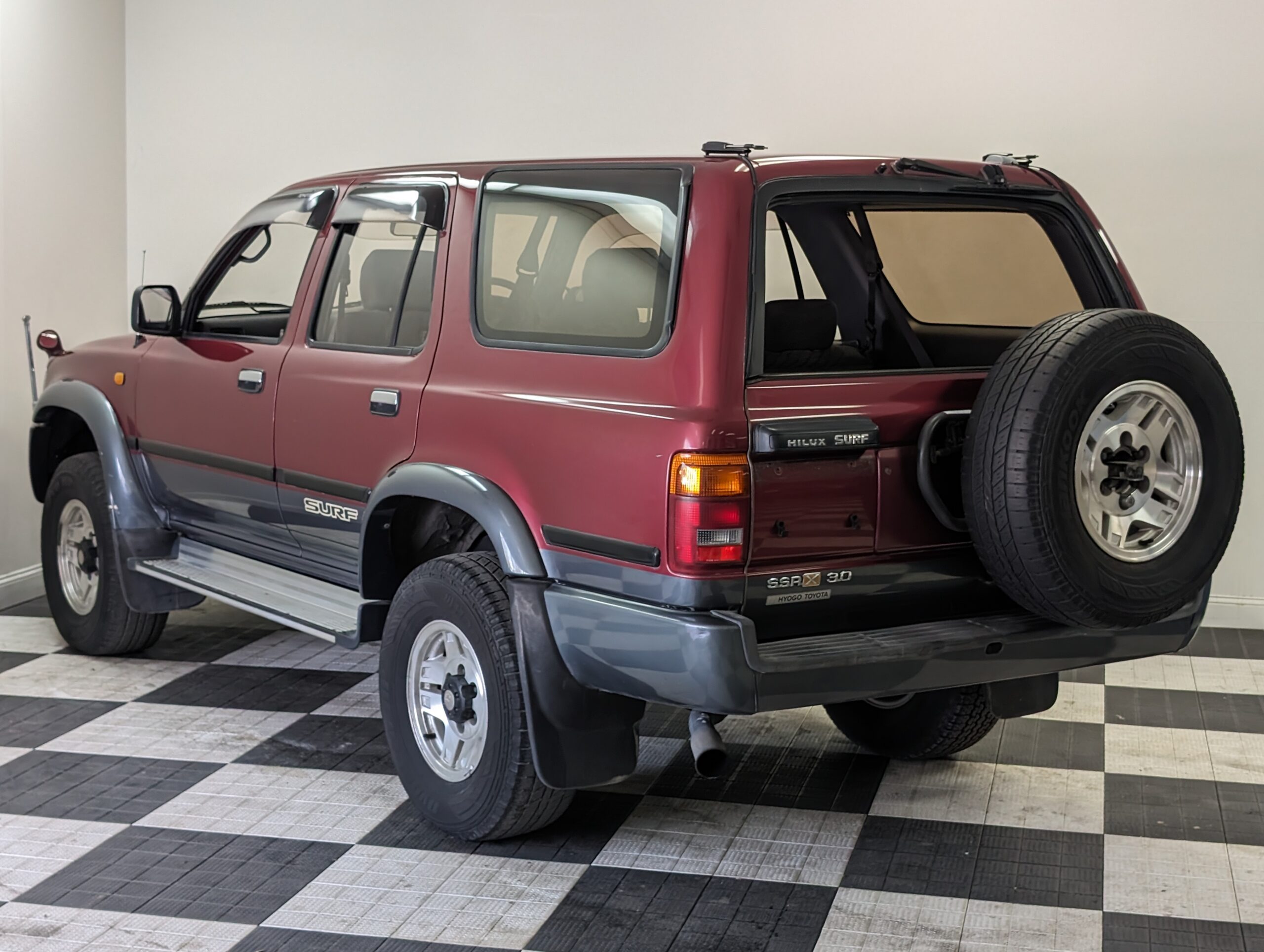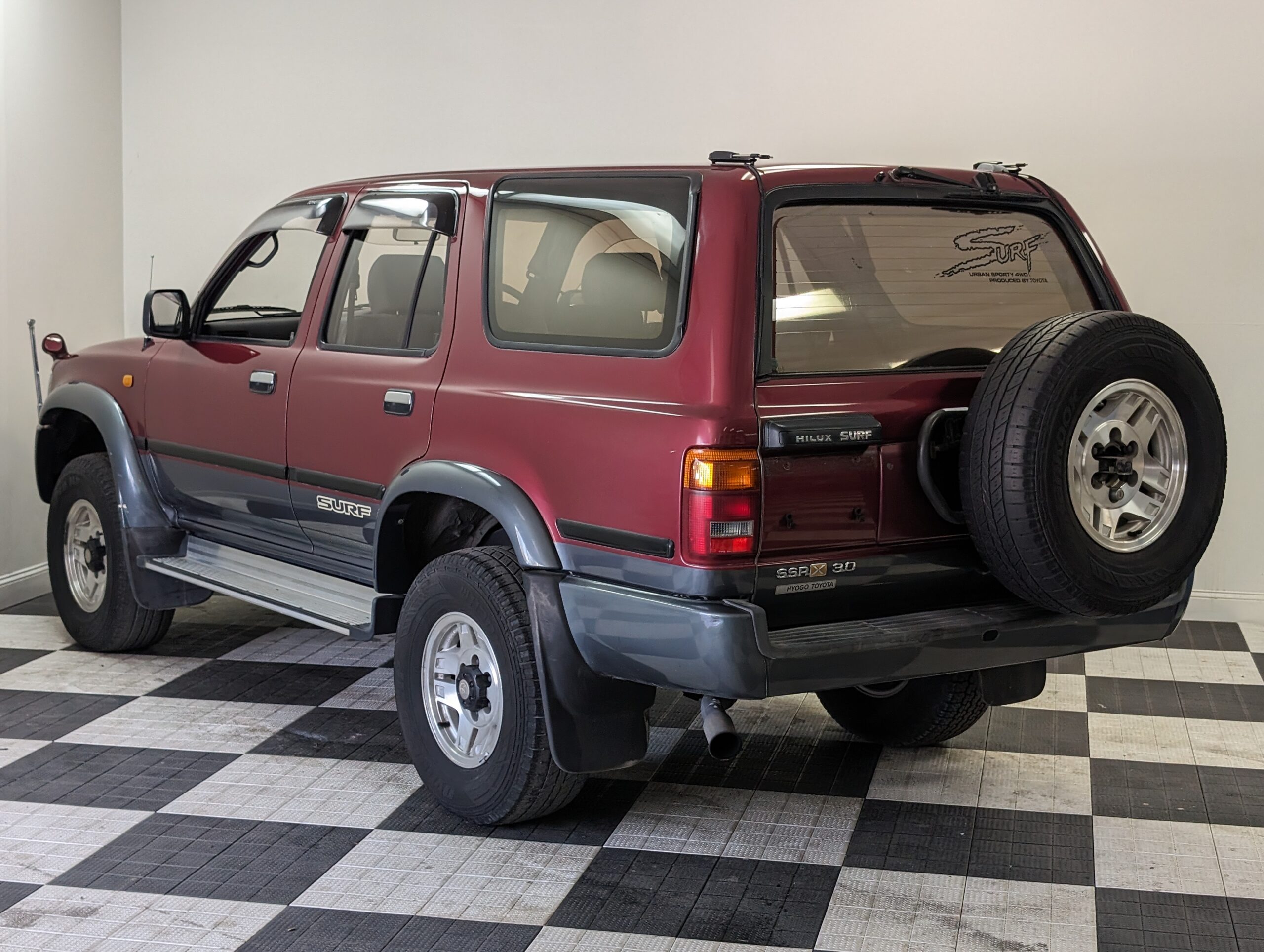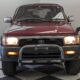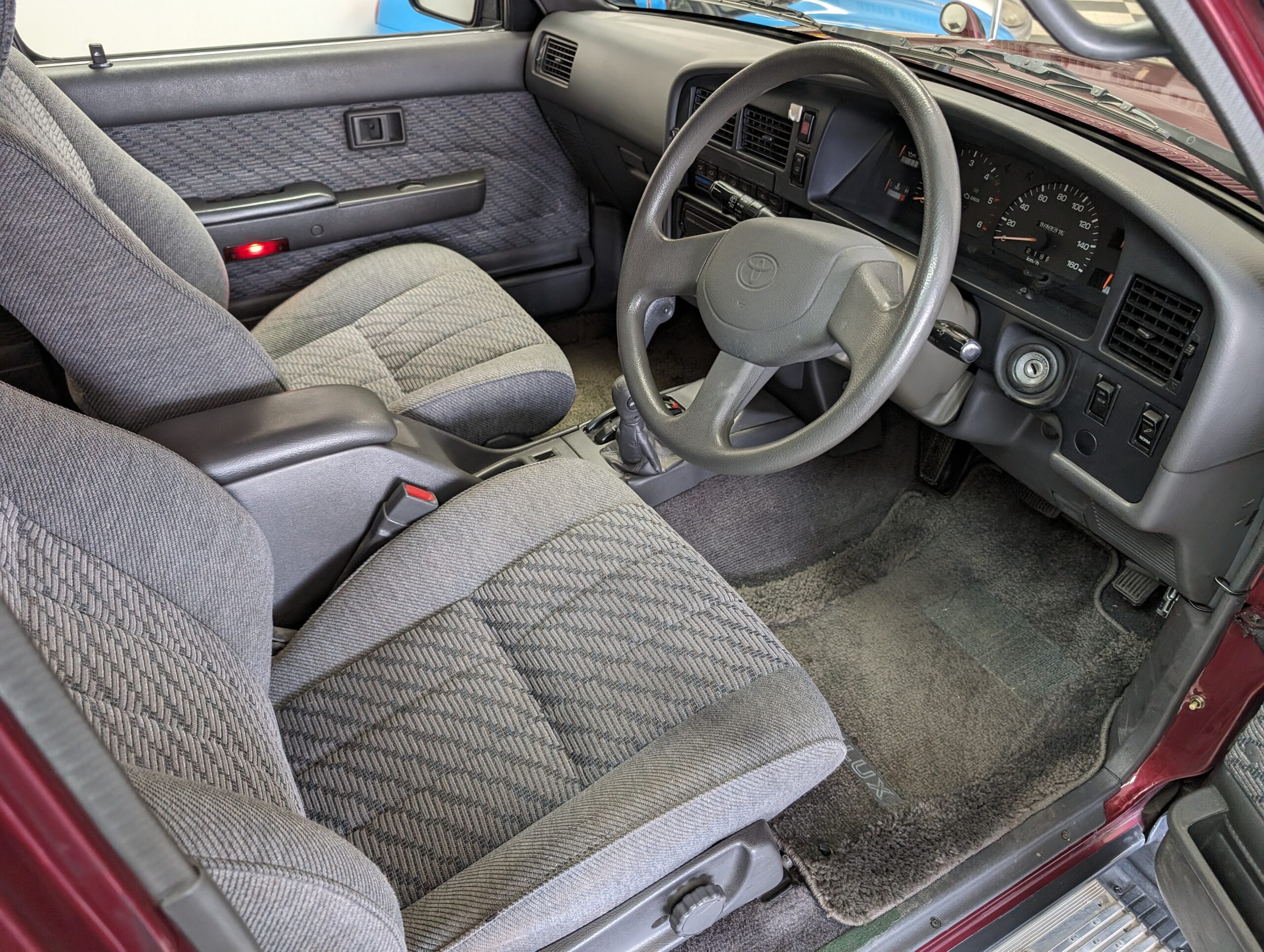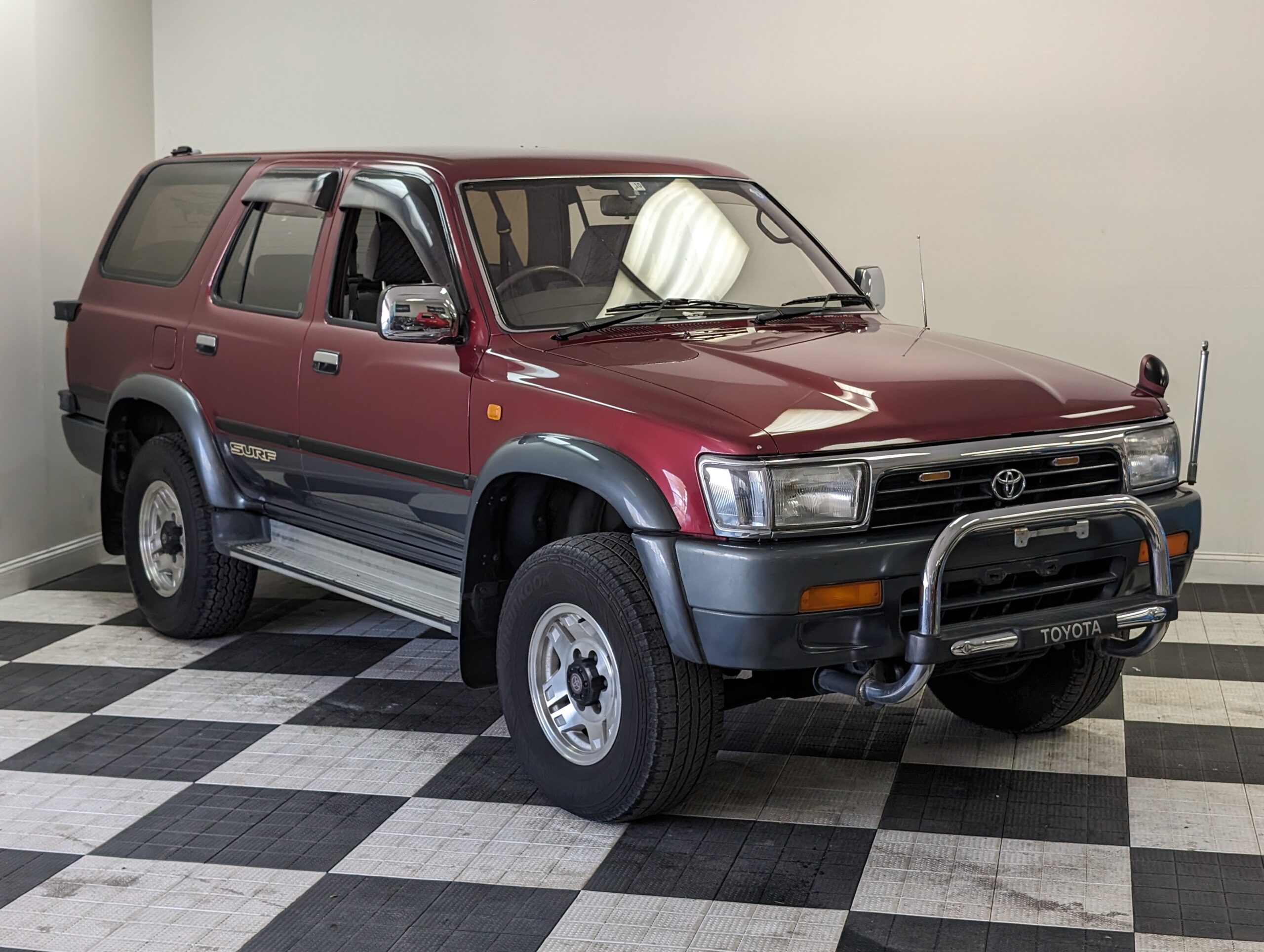 This 1995 Toyota Hilux is fitted with a 1KZ-TE turbodiesel 4-cylinder engine, 4-wheel drive, and 4-speed automatic transmission. It is painted red and gray two-tone metallic, with a gray interior.It has Toyota-branded window visors, push bar, and navigation head unit with pop-out screen and CD disc changer, while retaining all other factory equipment, including step bars.