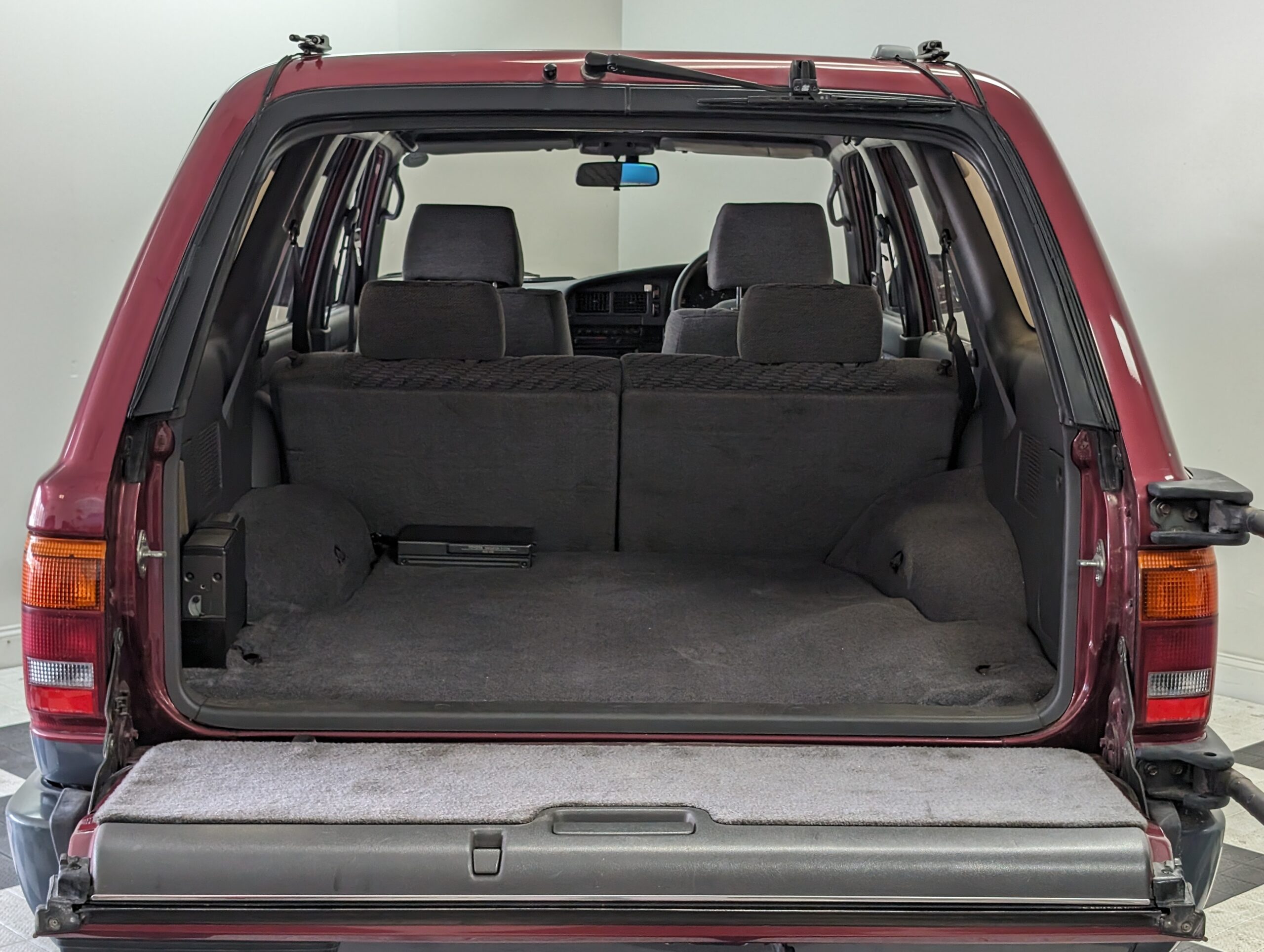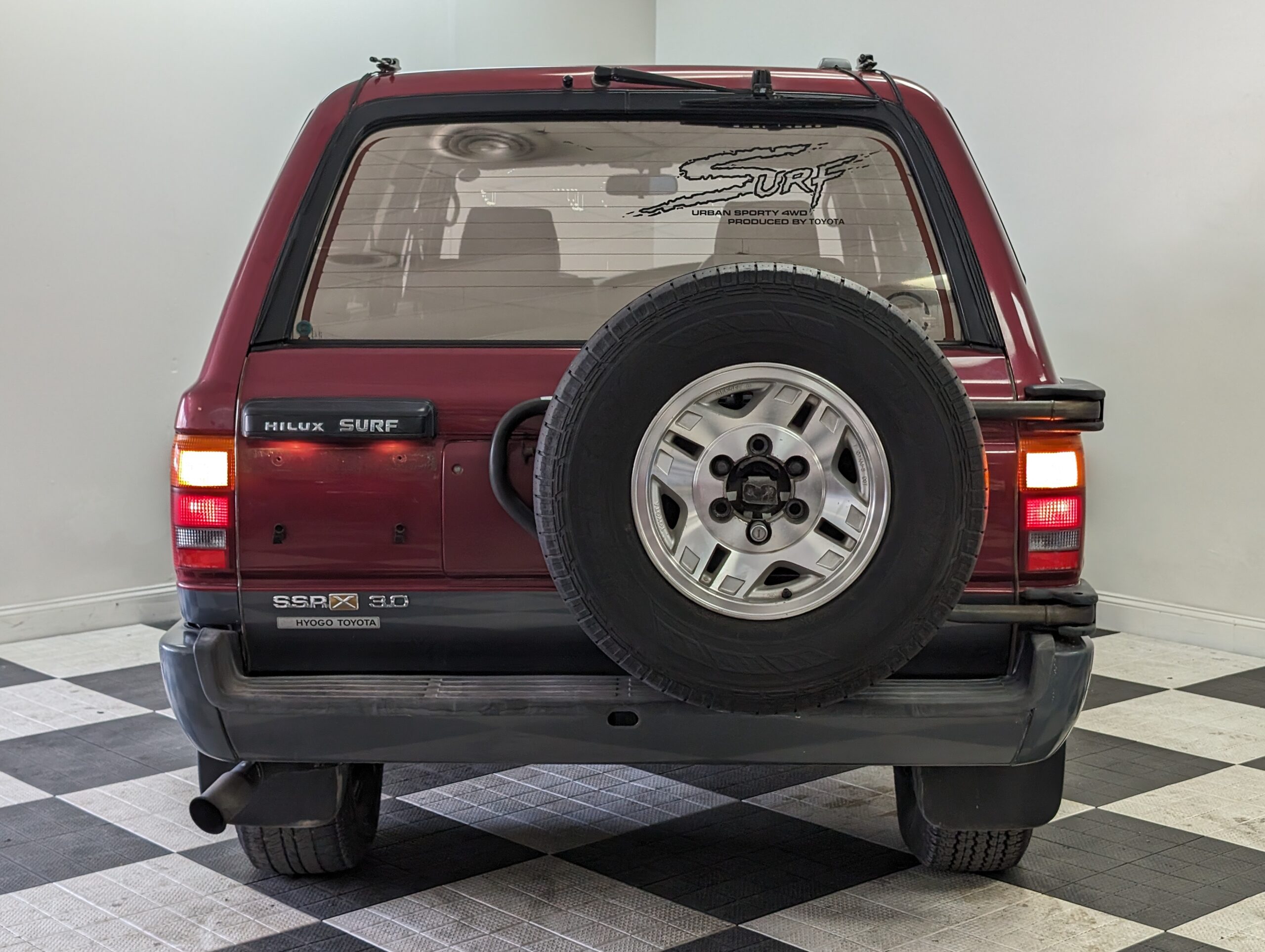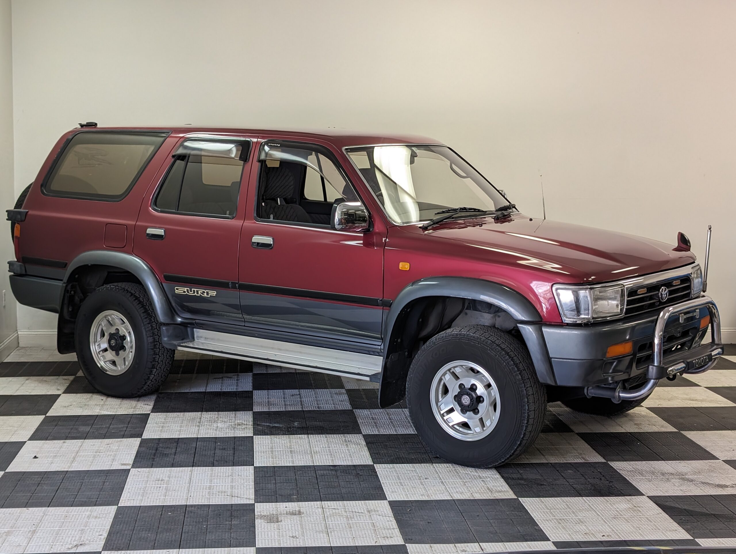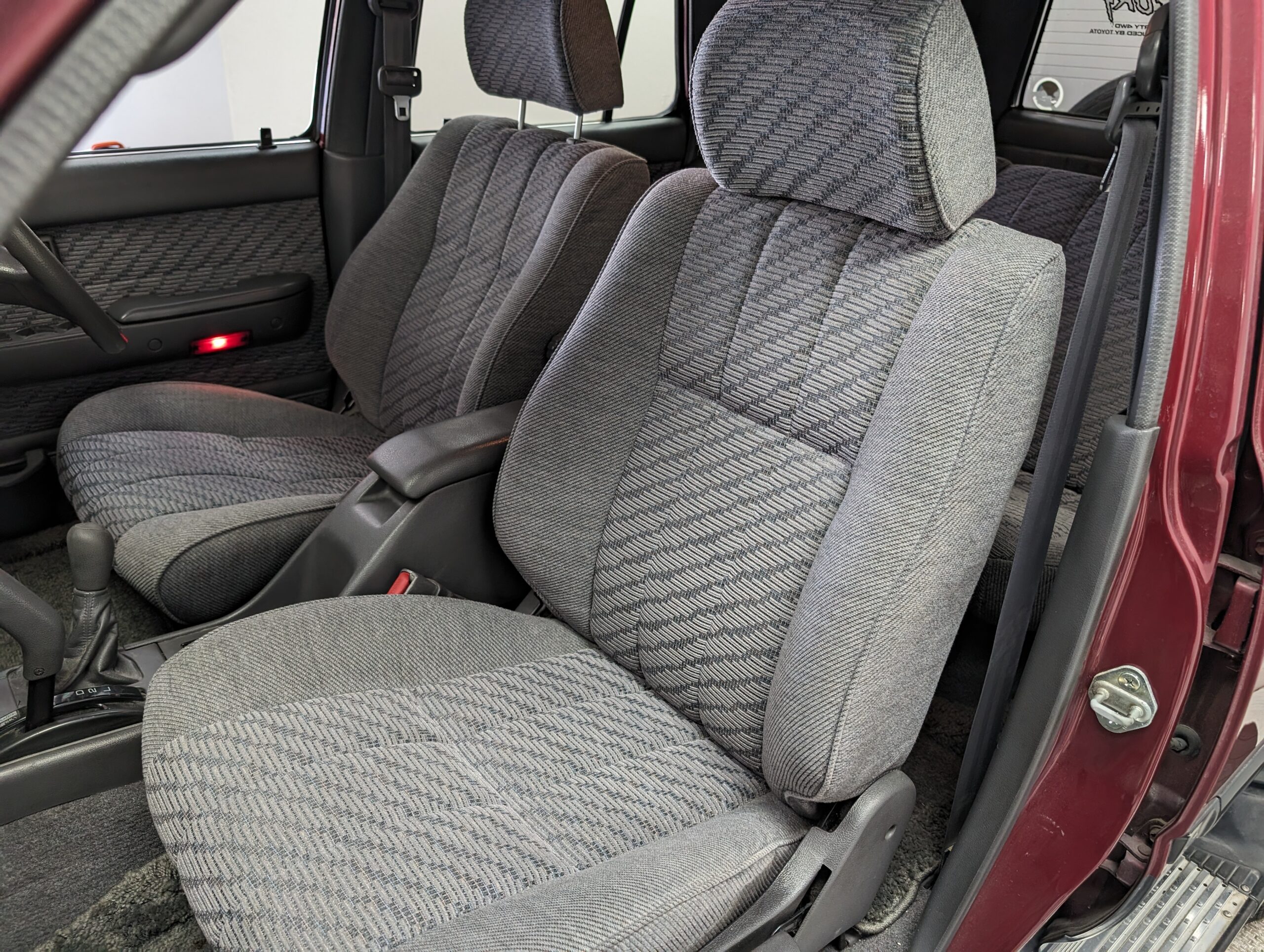 This 1995 Toyota Hilux is fitted with a 1KZ-TE turbodiesel 4-cylinder engine, 4-wheel drive, and 4-speed automatic transmission. It is painted red and gray two-tone metallic, with a gray interior.It has Toyota-branded window visors, push bar, and navigation head unit with pop-out screen and CD disc changer, while retaining all other factory equipment, including step bars.