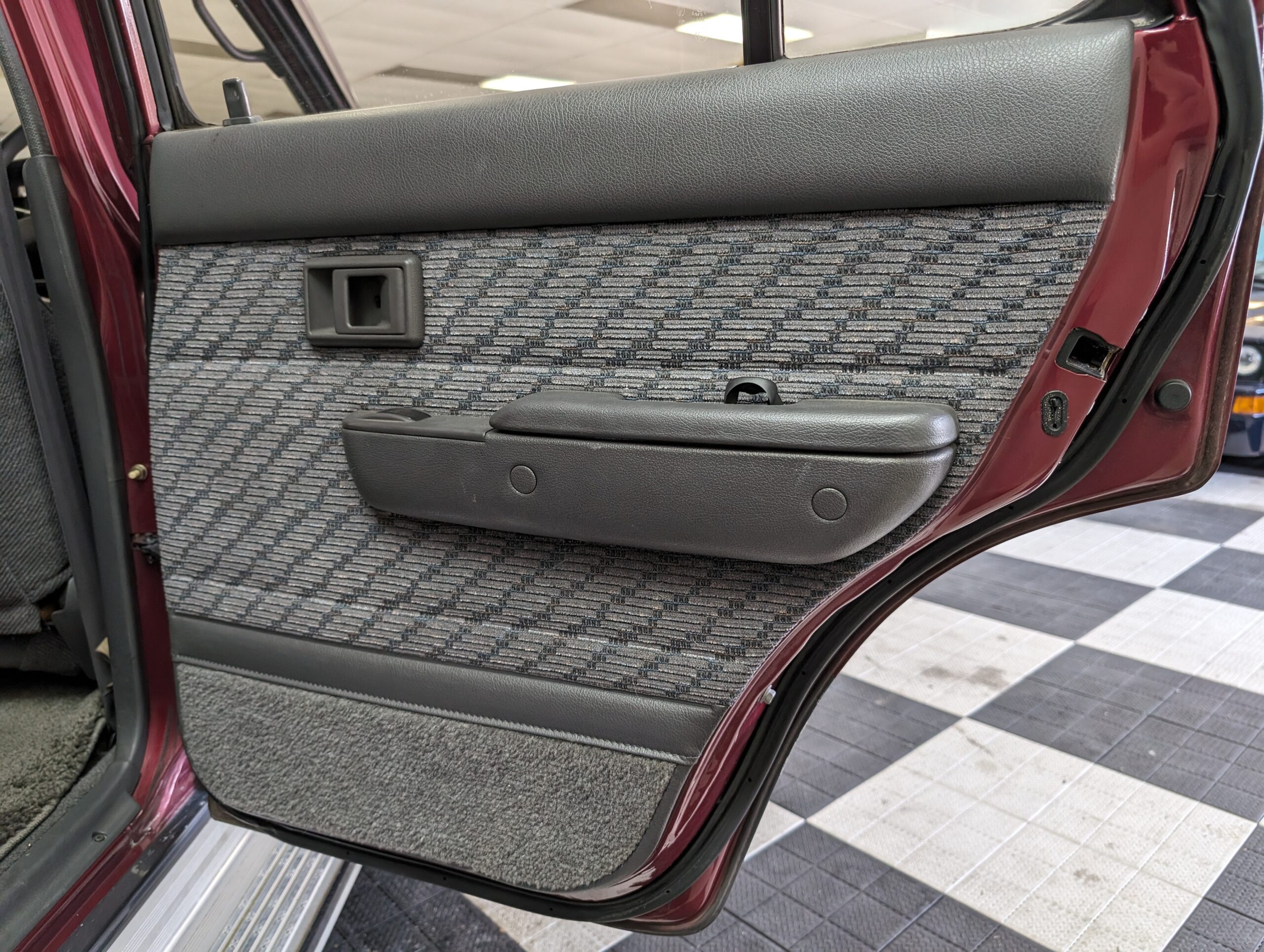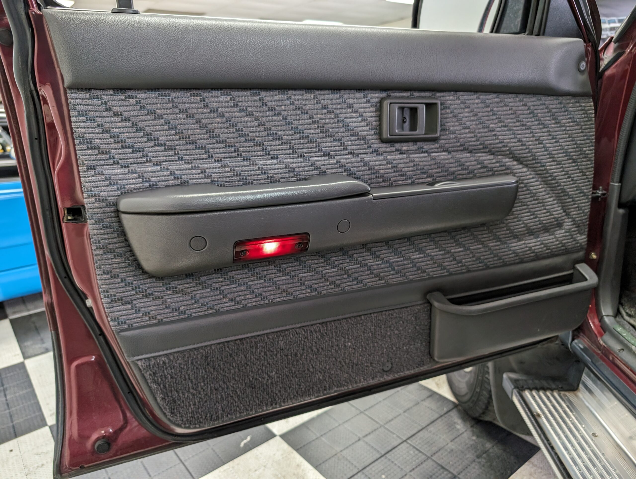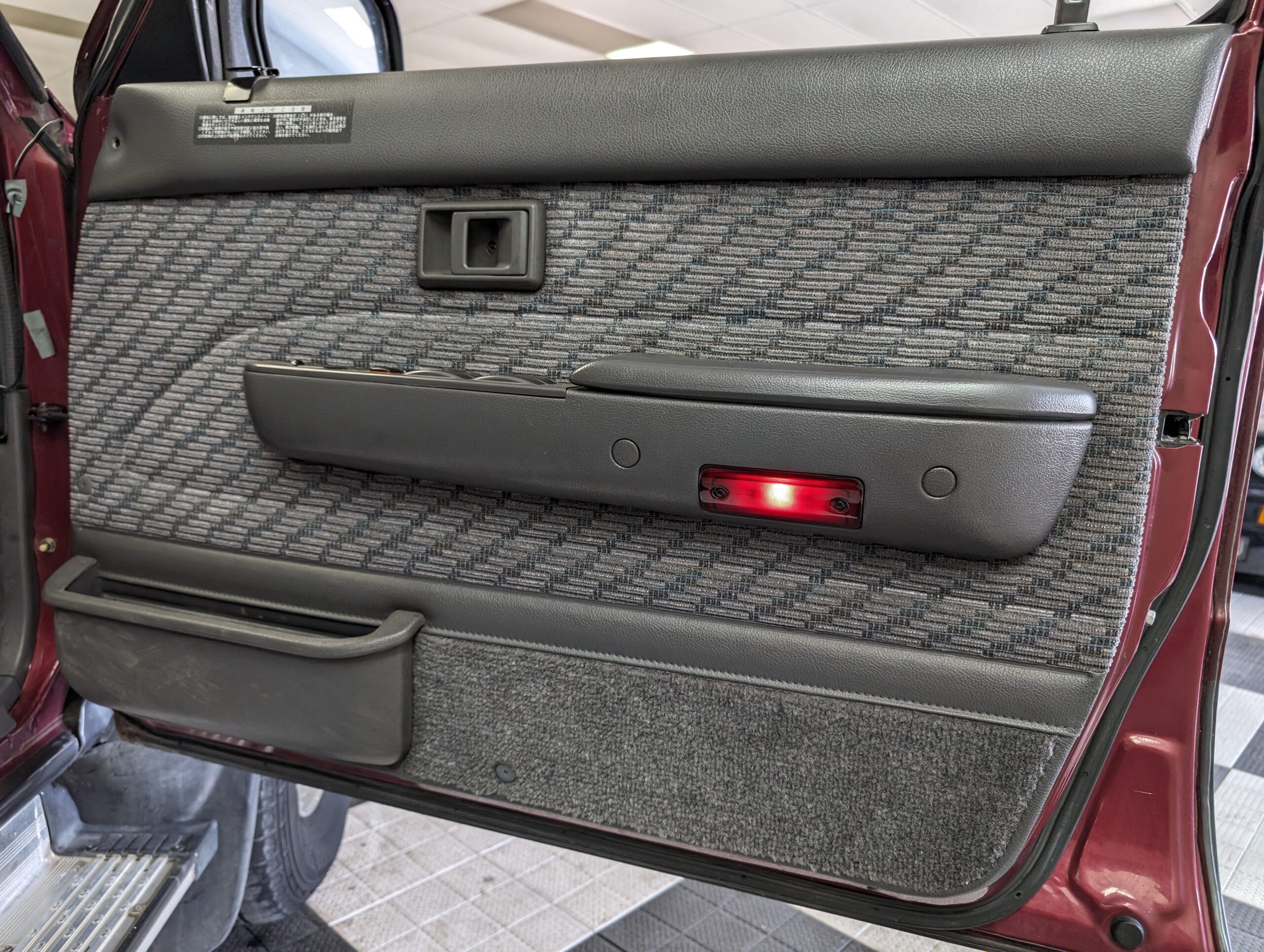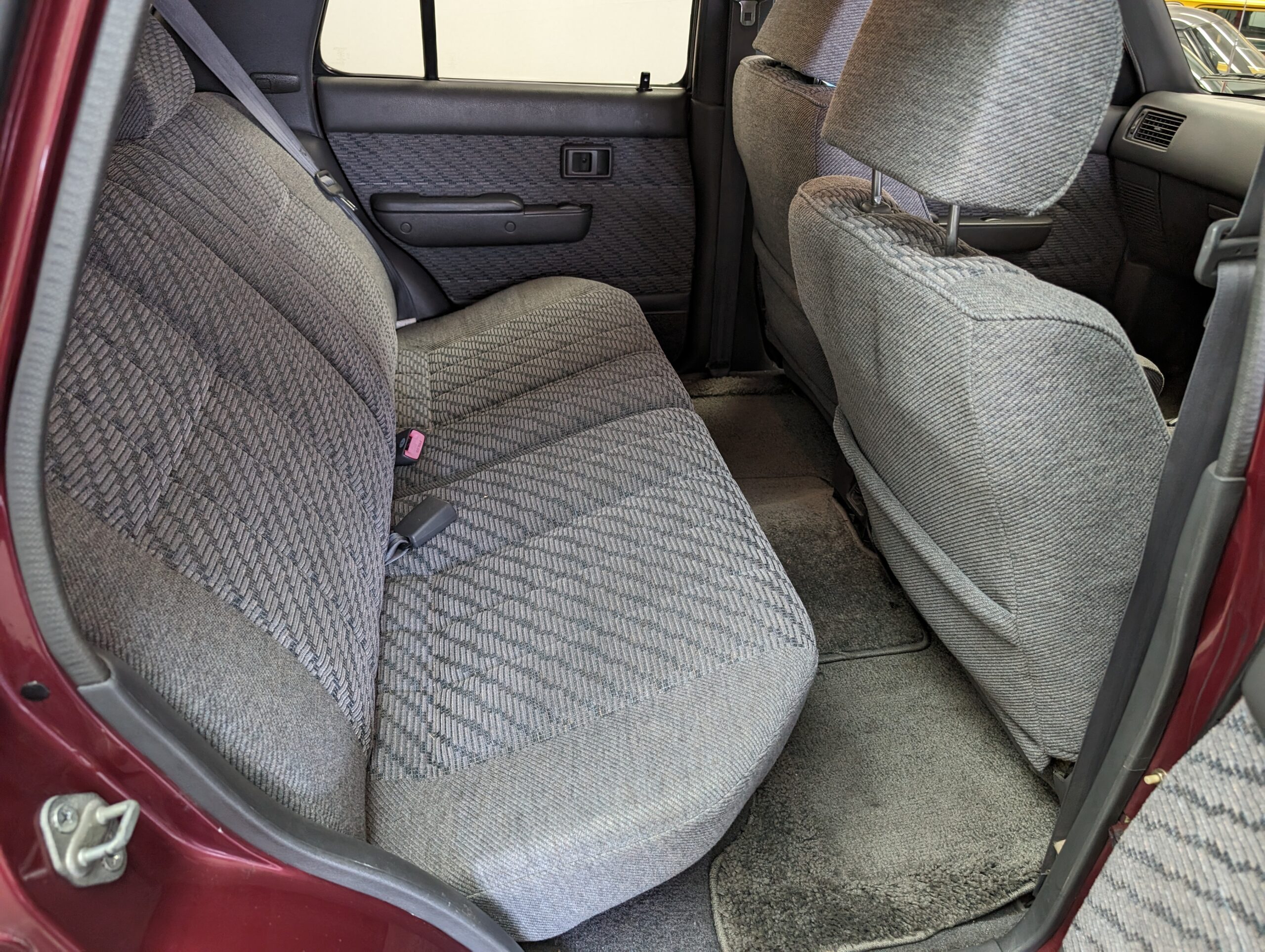 This 1995 Toyota Hilux is fitted with a 1KZ-TE turbodiesel 4-cylinder engine, 4-wheel drive, and 4-speed automatic transmission. It is painted red and gray two-tone metallic, with a gray interior.It has Toyota-branded window visors, push bar, and navigation head unit with pop-out screen and CD disc changer, while retaining all other factory equipment, including step bars.