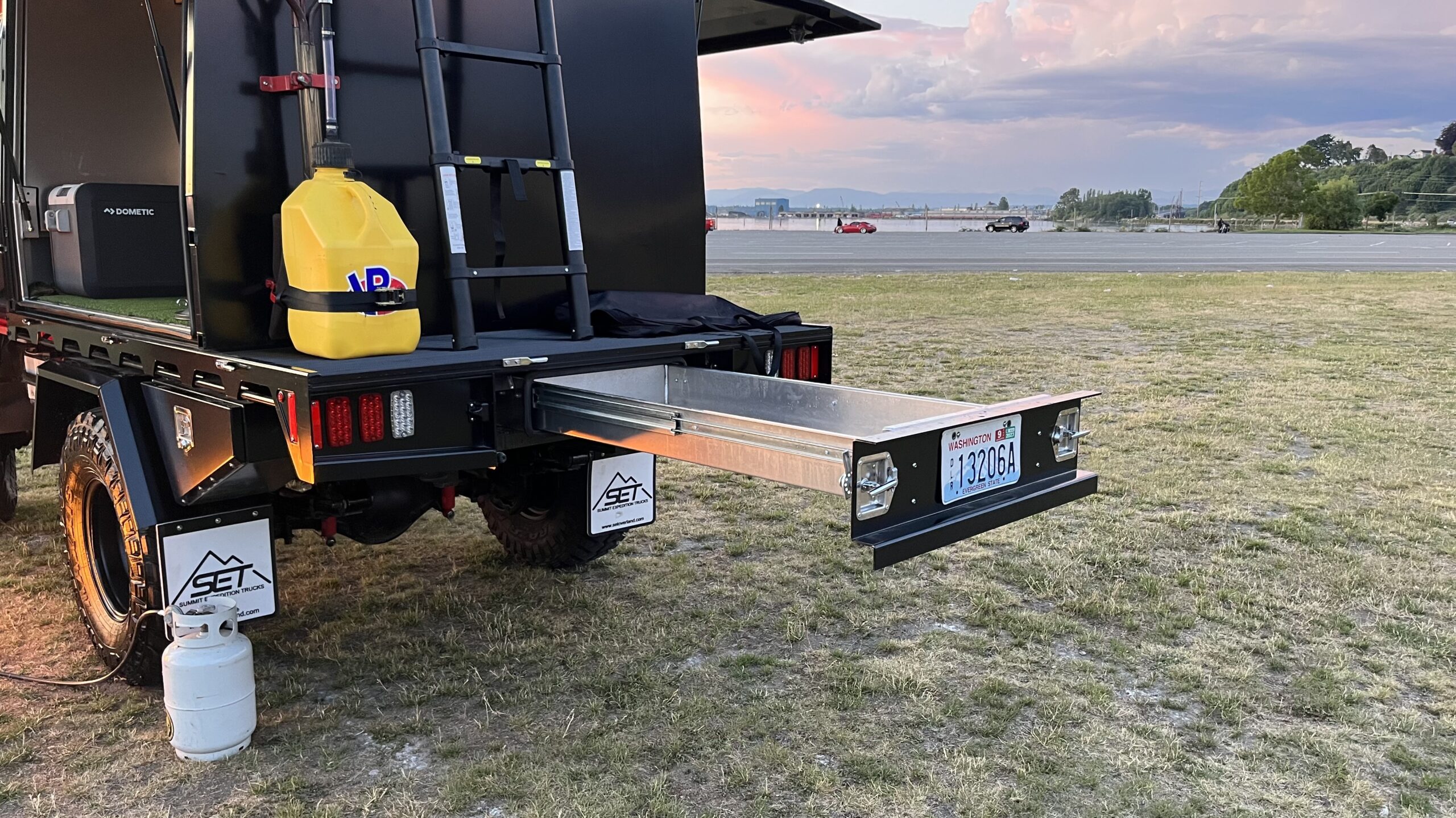 The frontrunner rack was custom fitted at the shop here and their undermount pro stainless prep table mounted fitted well to T-slotted ceiling of the SET Canopy