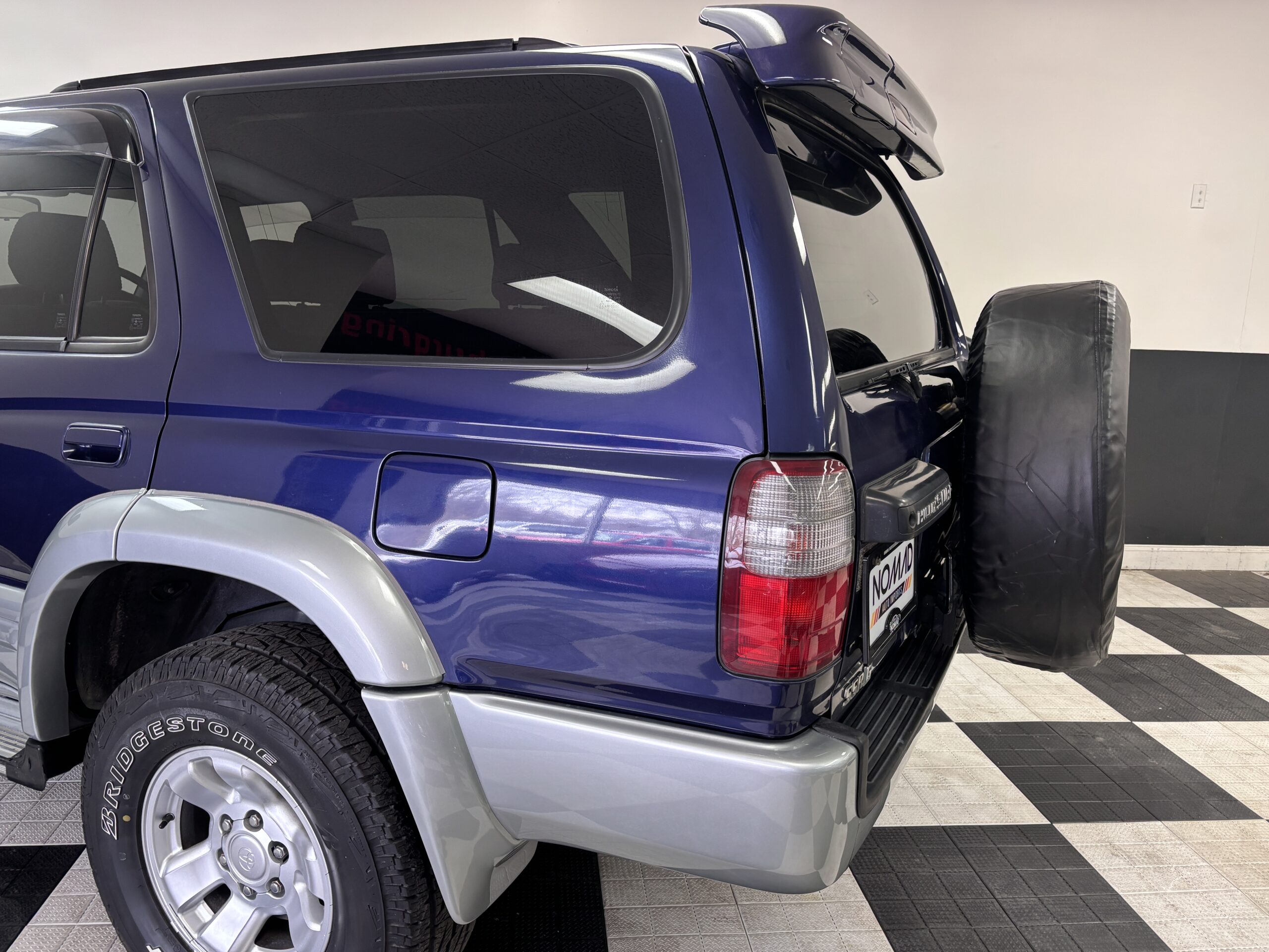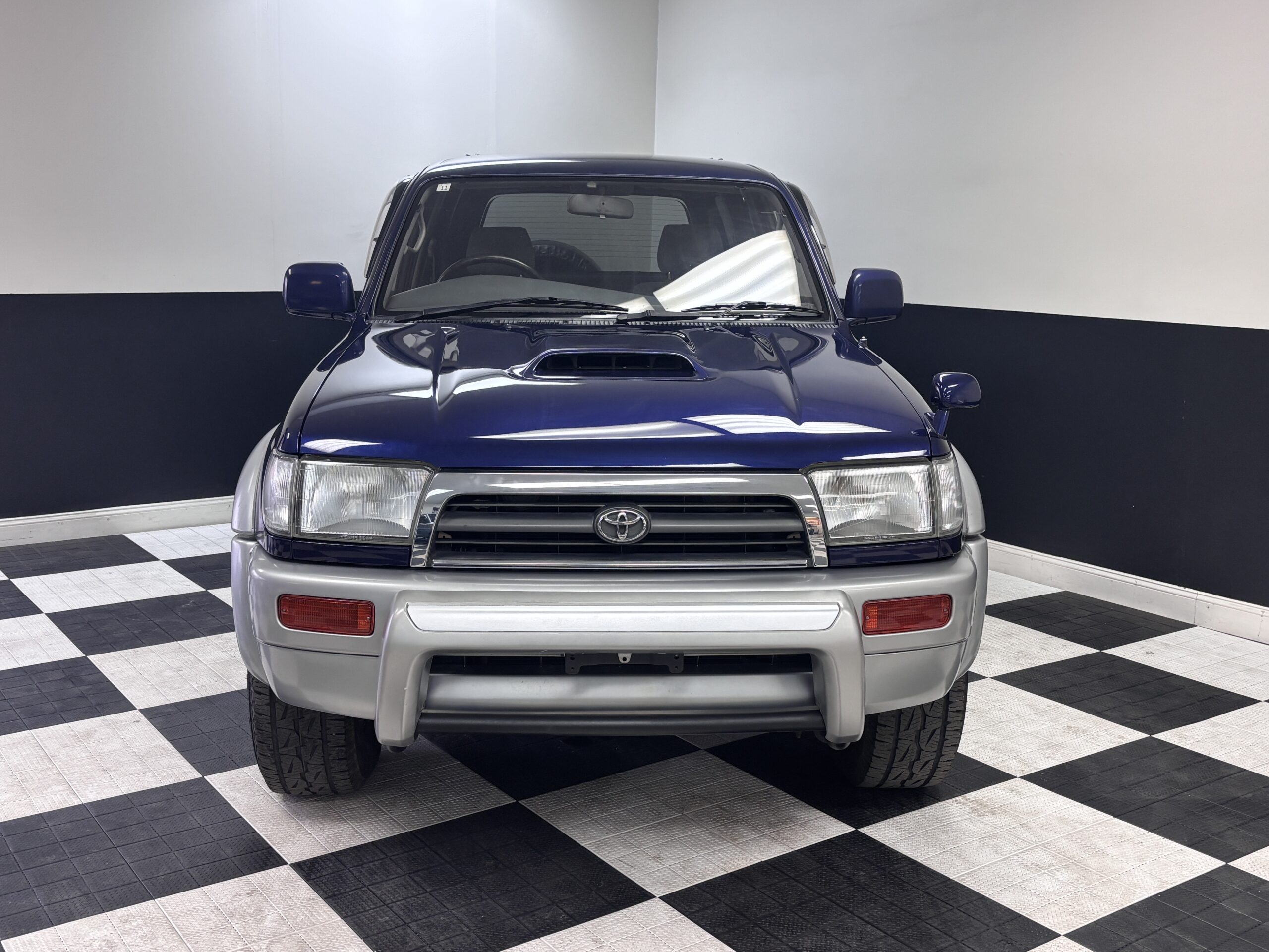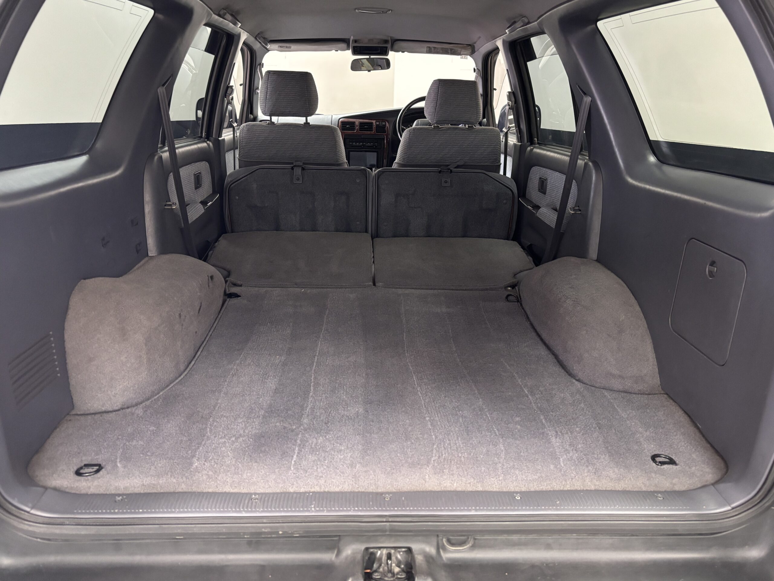 This 1996 Toyota Hilux Surf is equipped with a 1KZ-TE 4-cylinder turbo diesel engine mated to a 4-speed automatic transmission. Interior features an aftermarket Kenwood head unit, and grey cloth interior. The exterior features the factory powered rear spoiler mirror, factory fender mirror, as well as rear mounted spare with cover.