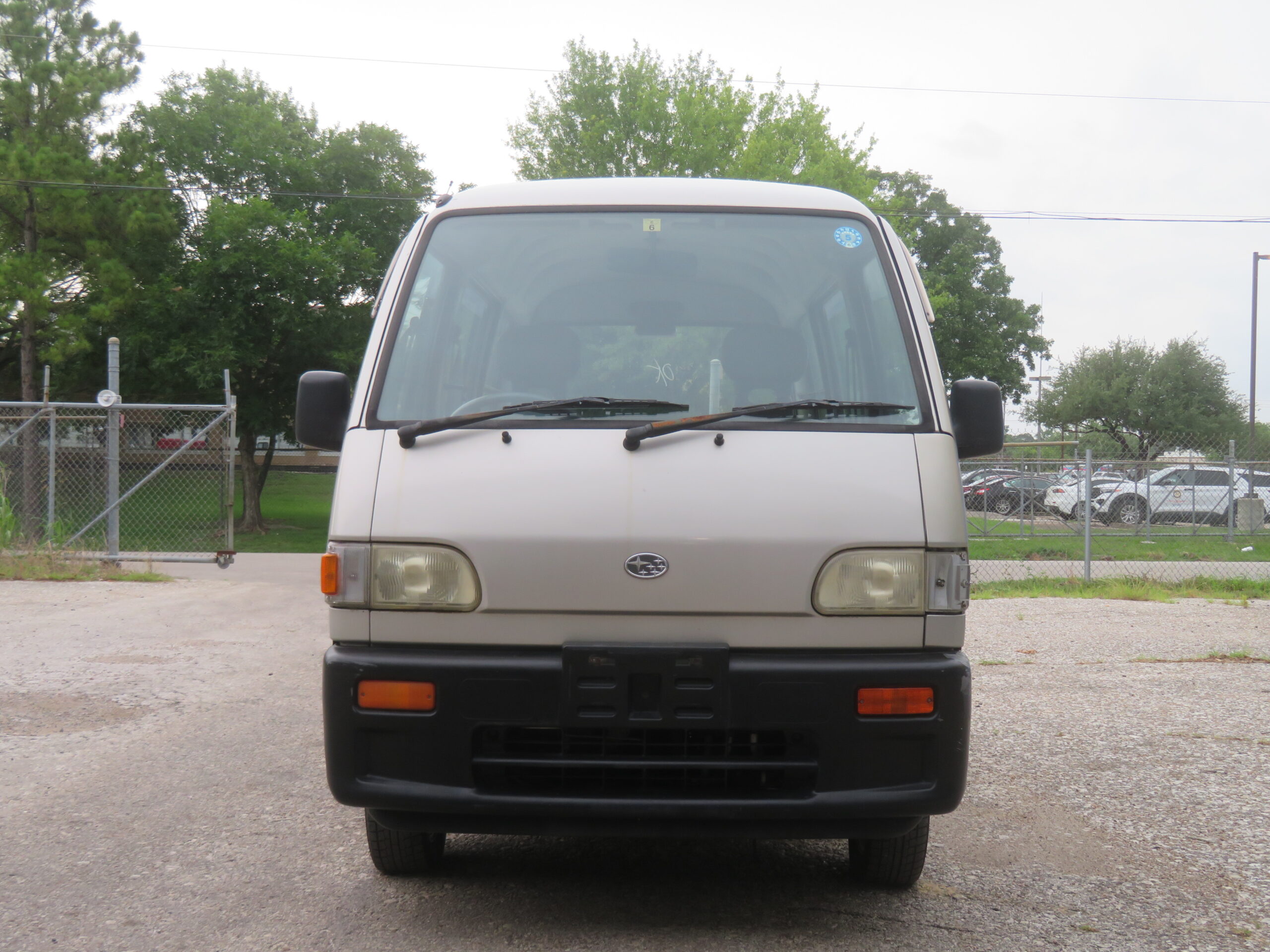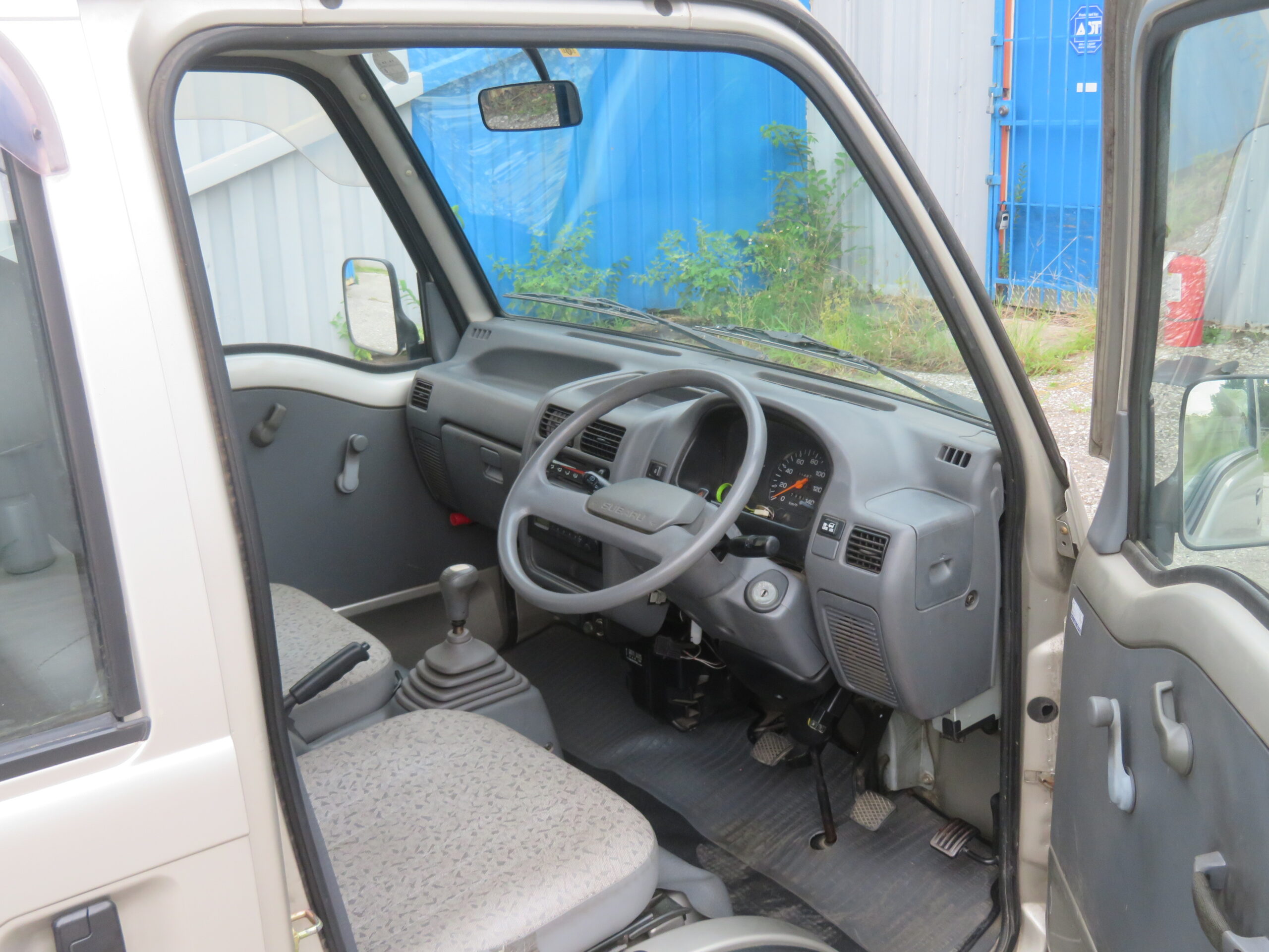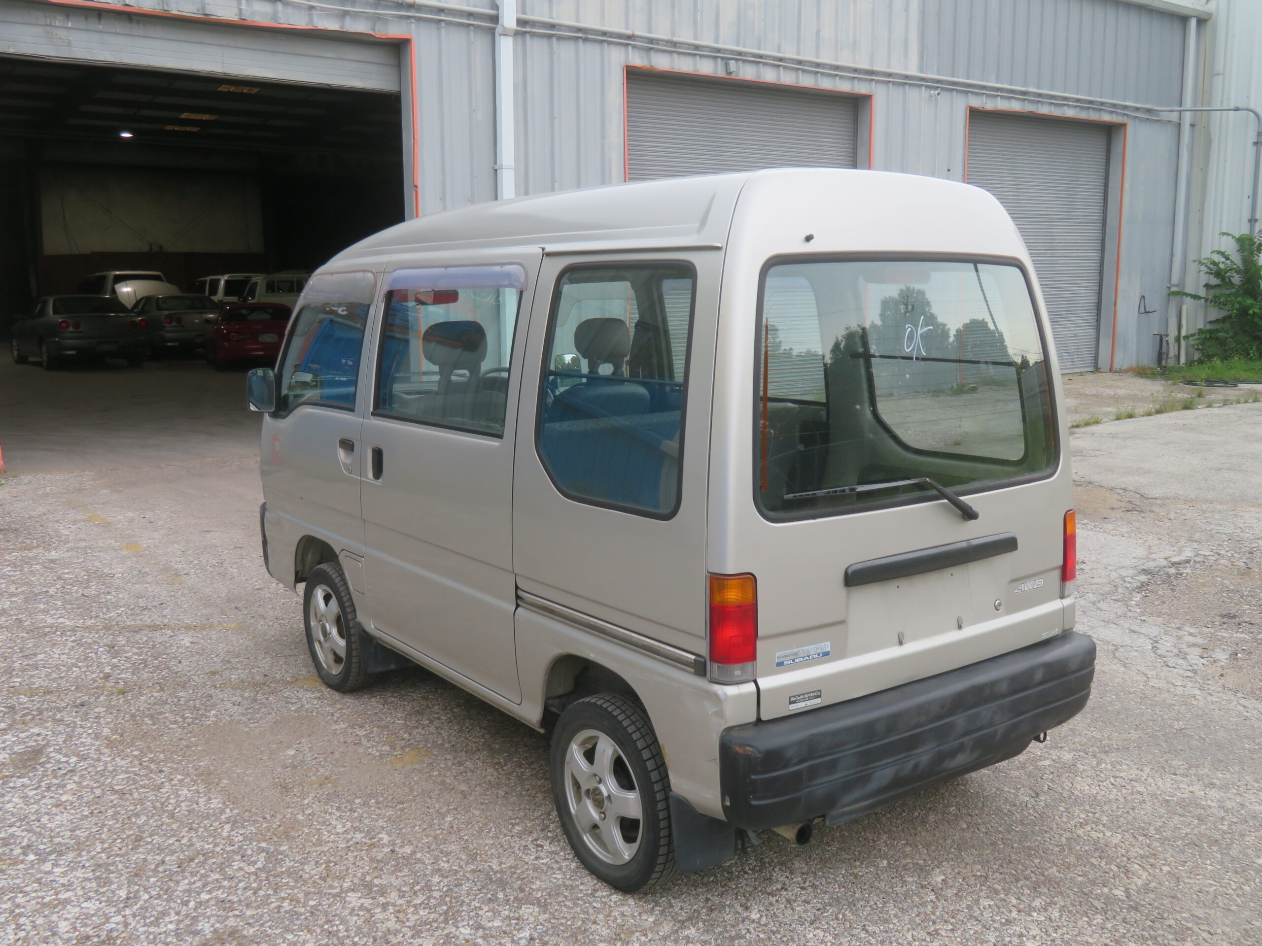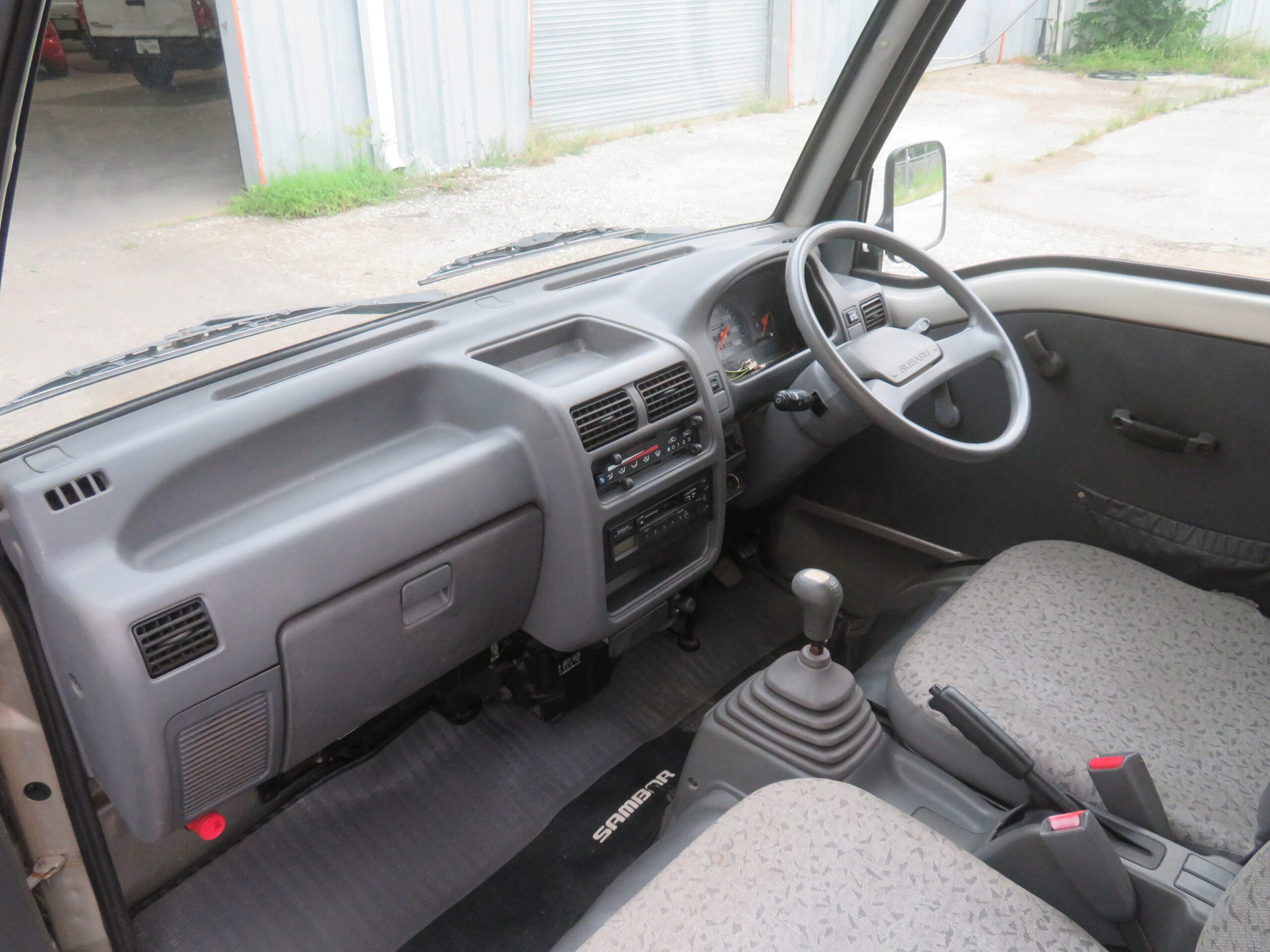 The Subaru Sambar Van is in good running condition. The engine starts right away, and the suspension is smooth and good. The manual transmission shifts smoothly into all gears. The radio is in working condition. However, the AC needs recharging, and the passenger side turn signal cover is missing.