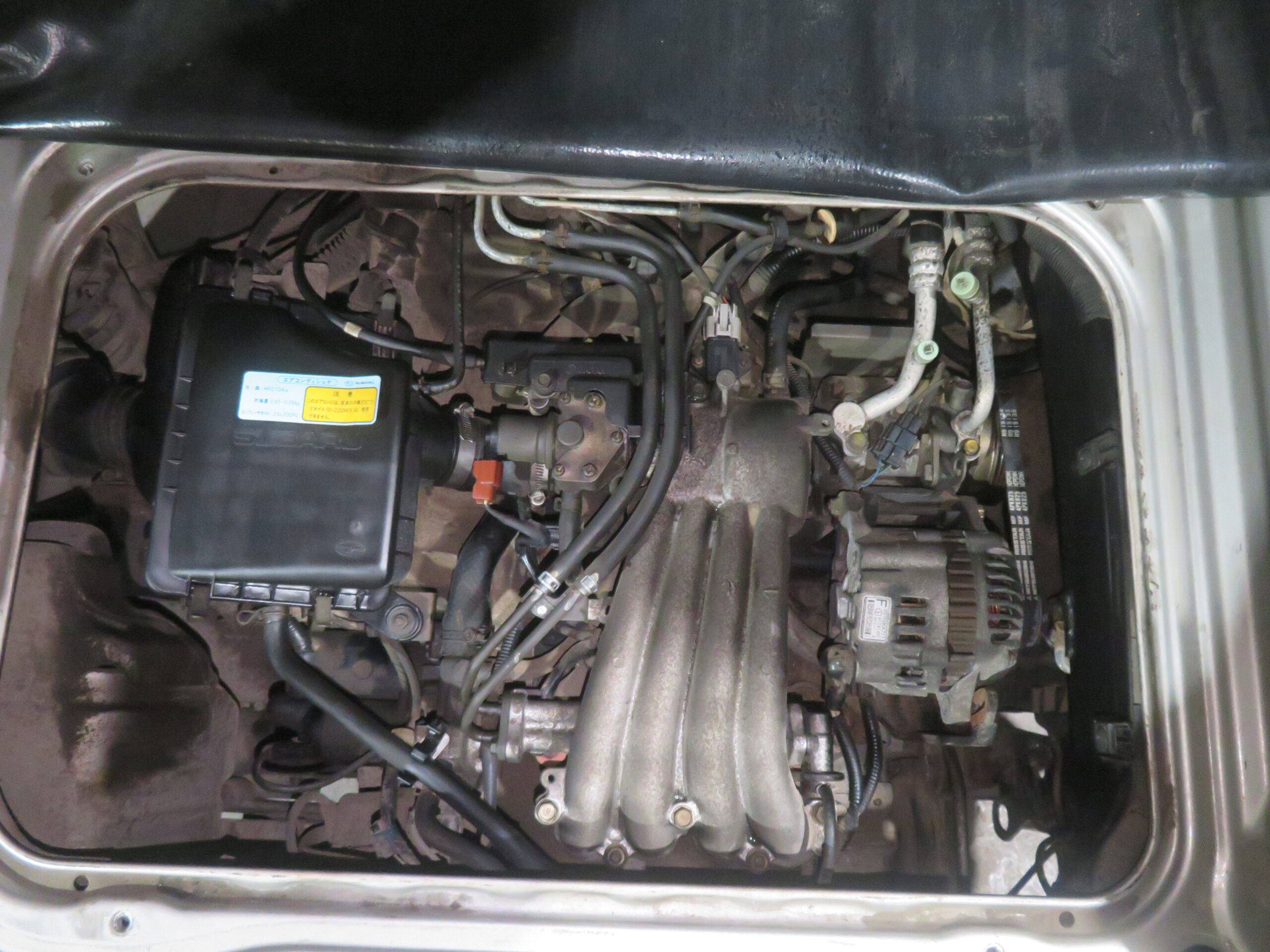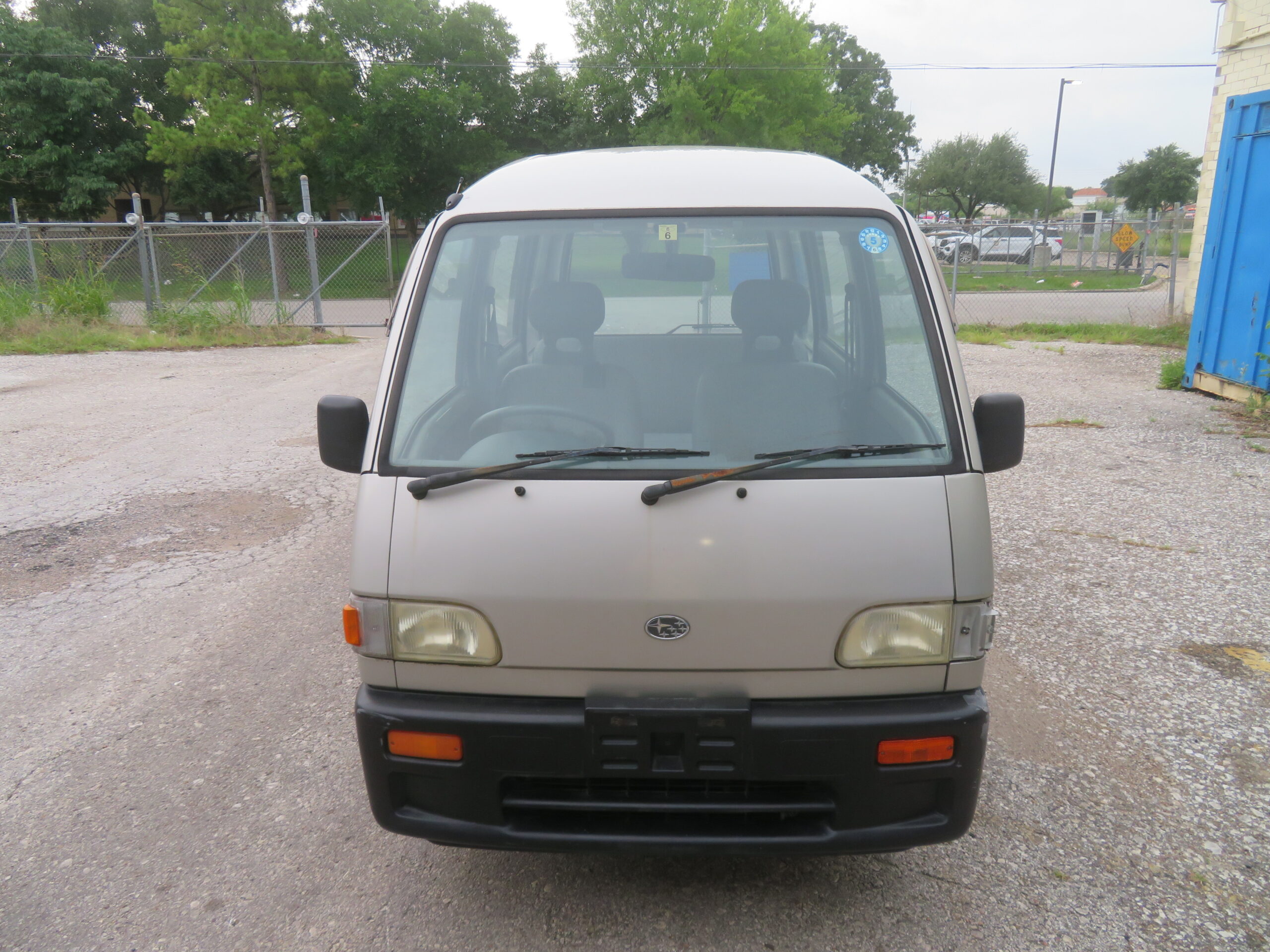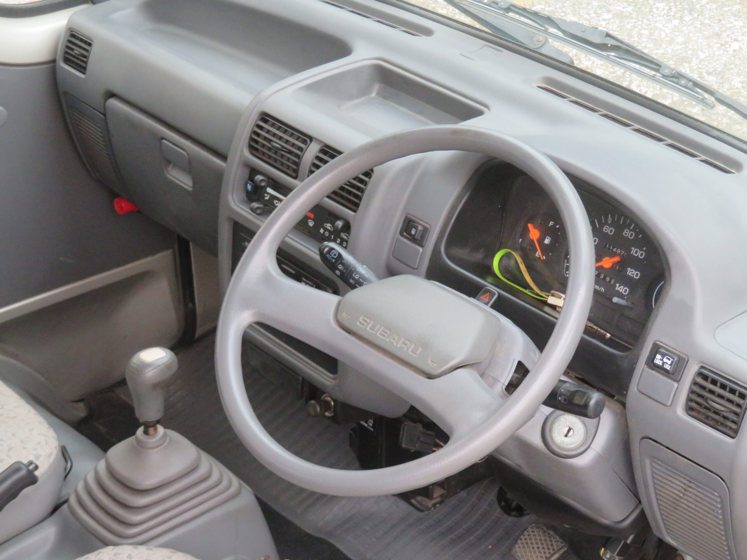 The Subaru Sambar Van is in good running condition. The engine starts right away, and the suspension is smooth and good. The manual transmission shifts smoothly into all gears. The radio is in working condition. However, the AC needs recharging, and the passenger side turn signal cover is missing.