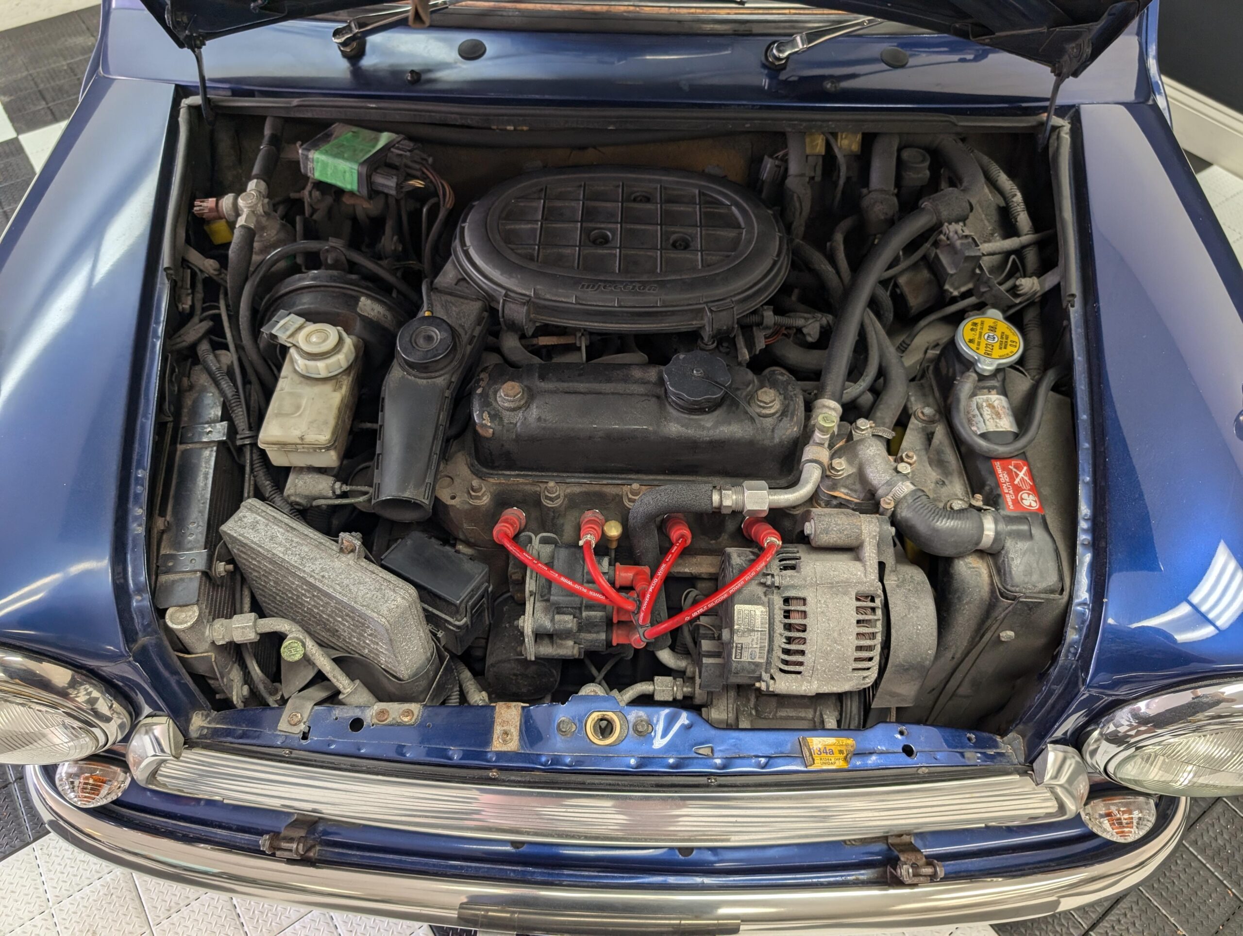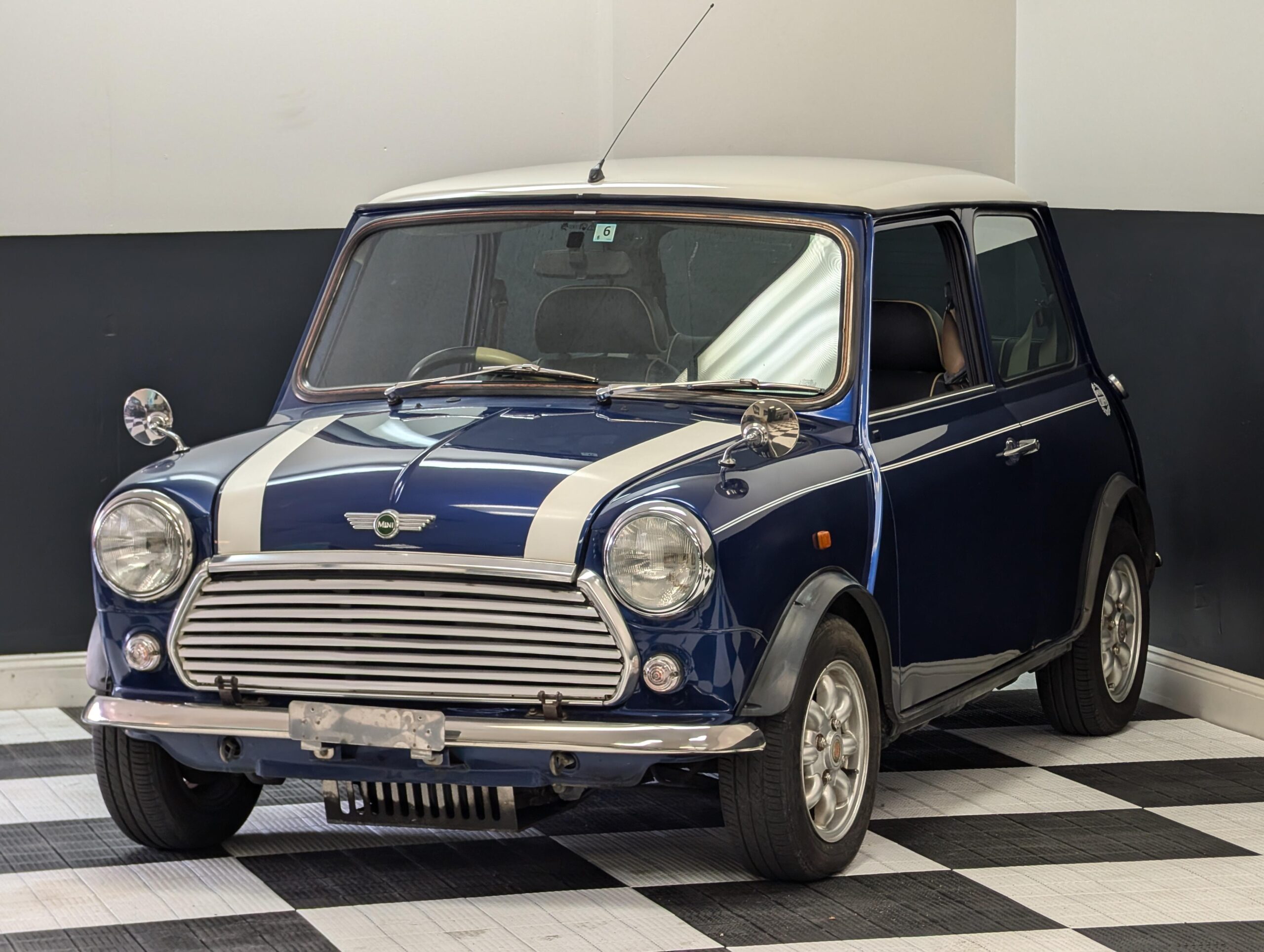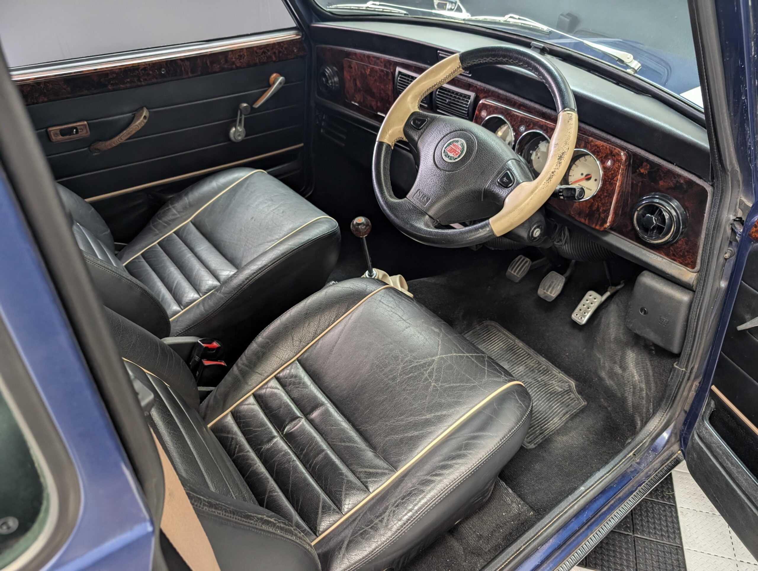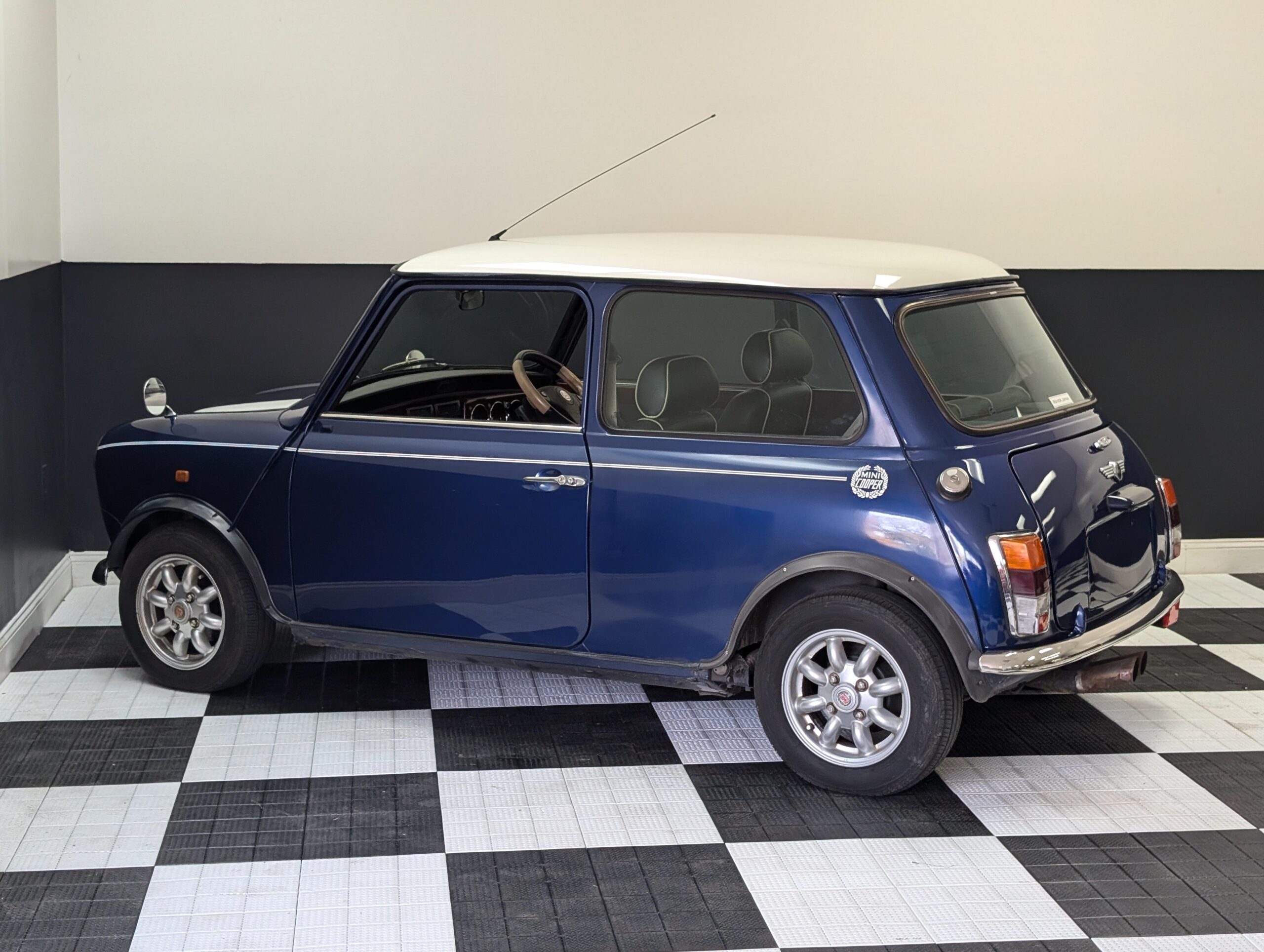 This 1998 Rover Mini Cooper 1.3i is painted Tahiti blue with a black leather interior. The car has a 1.3-liter 4-cylinder fuel-injected engine, backed by a 4-speed manual transmission. It is equipped with air conditioning.