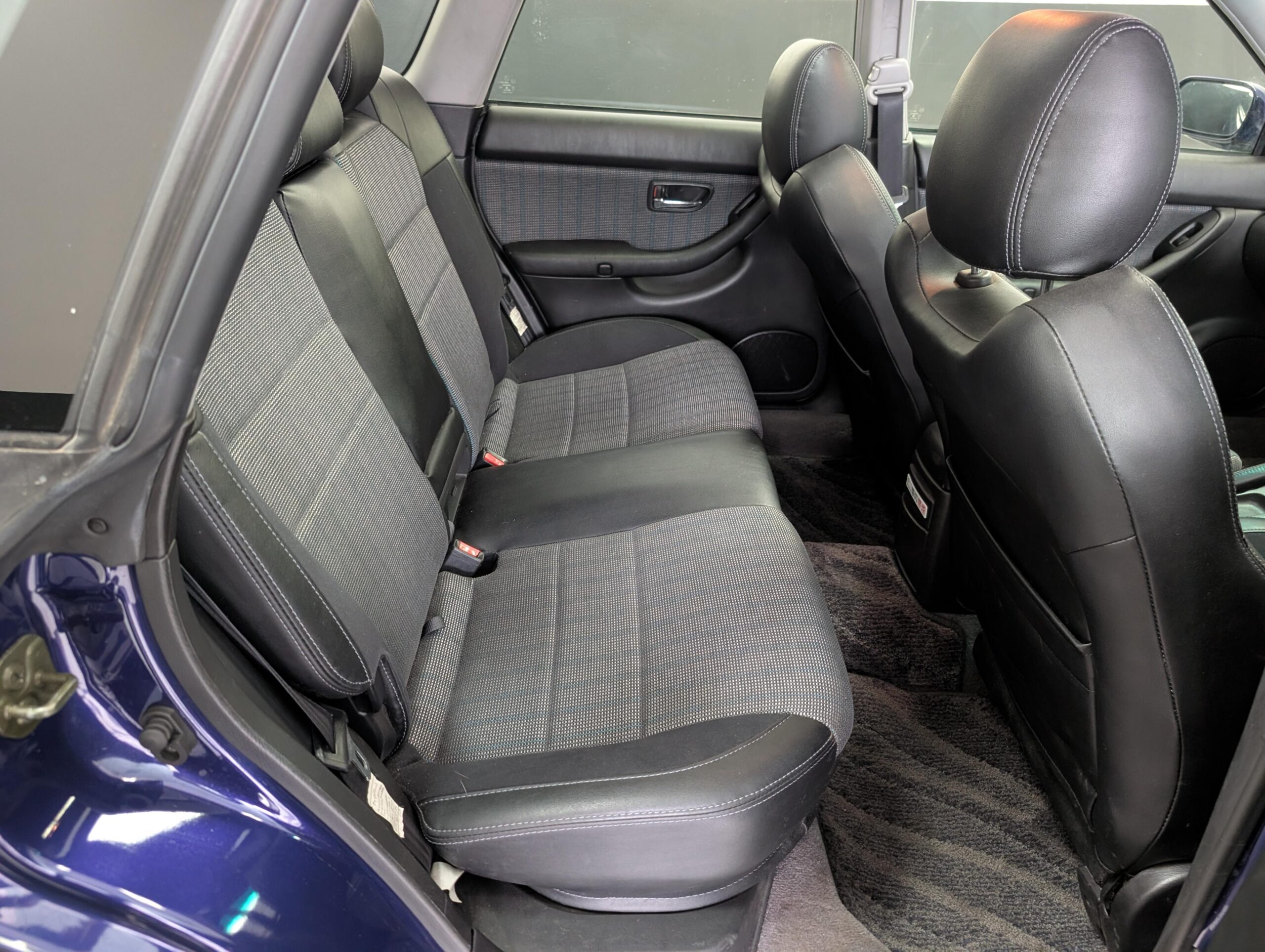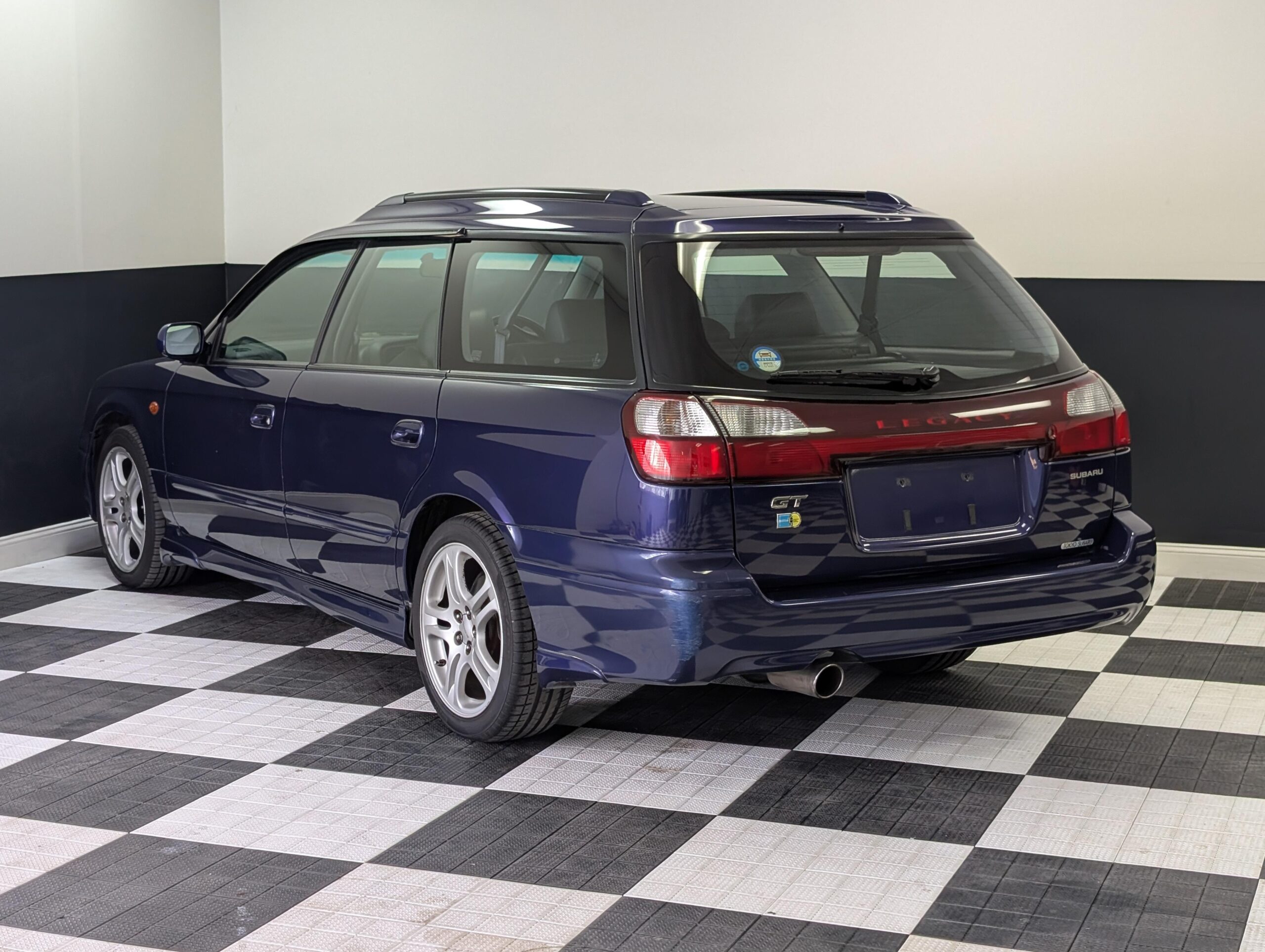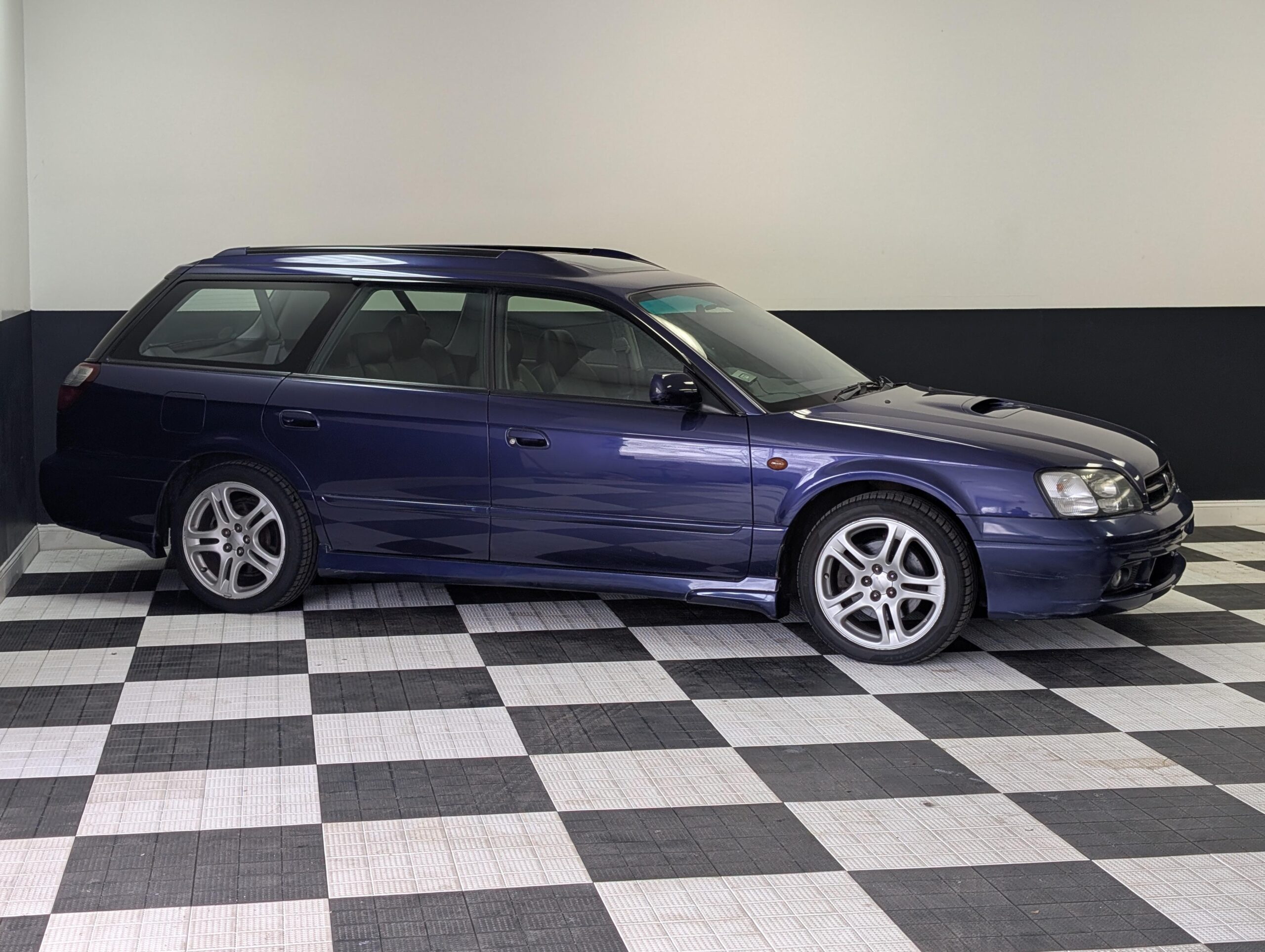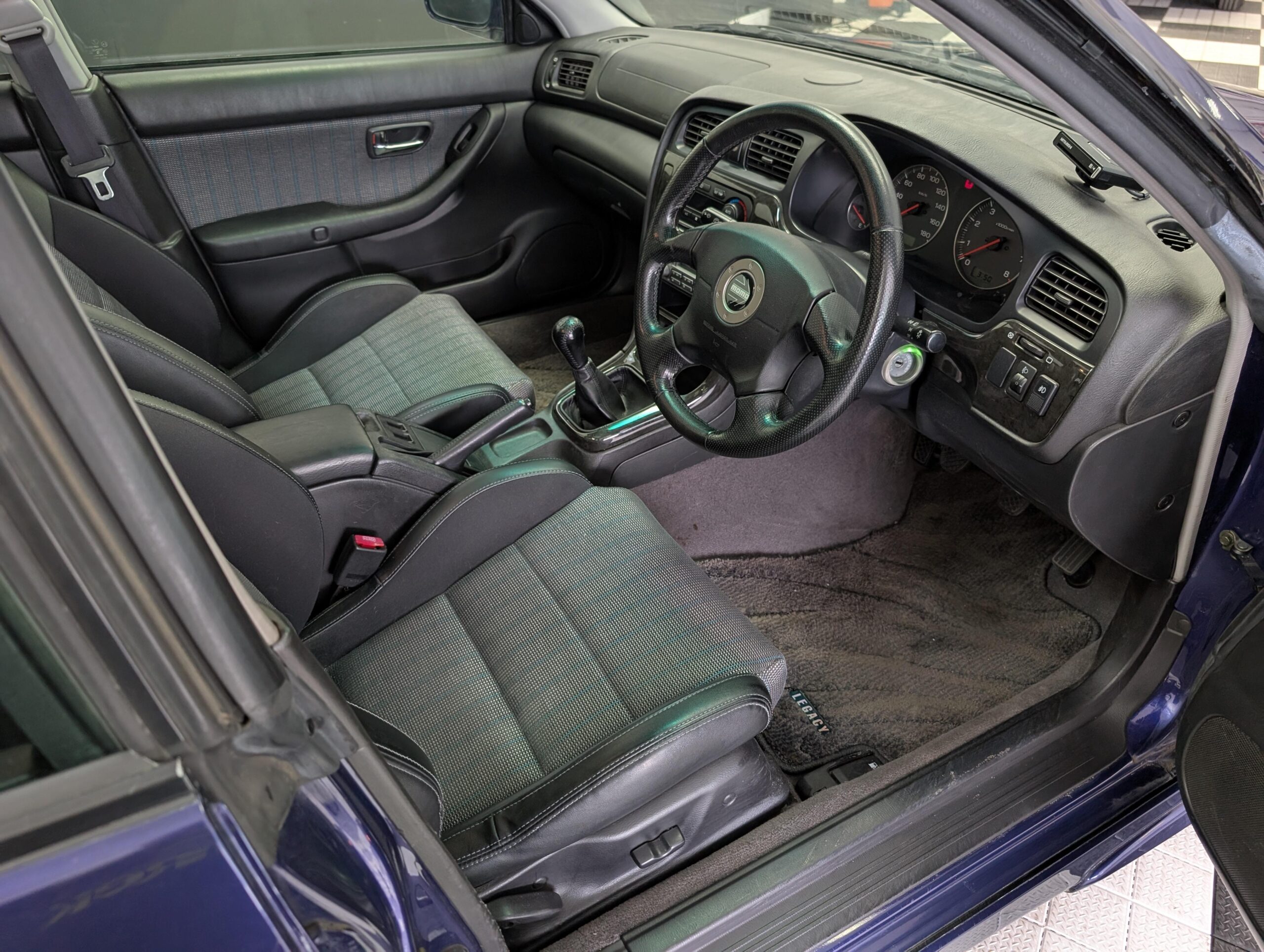 This Legacy has a dark blue exterior and black leather/cloth interior, a stock 2.0L EJ20 twin turbo engine with 276hp and a 5-speed manual transmission with limited-slip diferential, electric folding mirrors, air conditioning, window visors, double sunroofs, and fog lamps. It has a Kenwood head unit, and retains all other factory equipment.