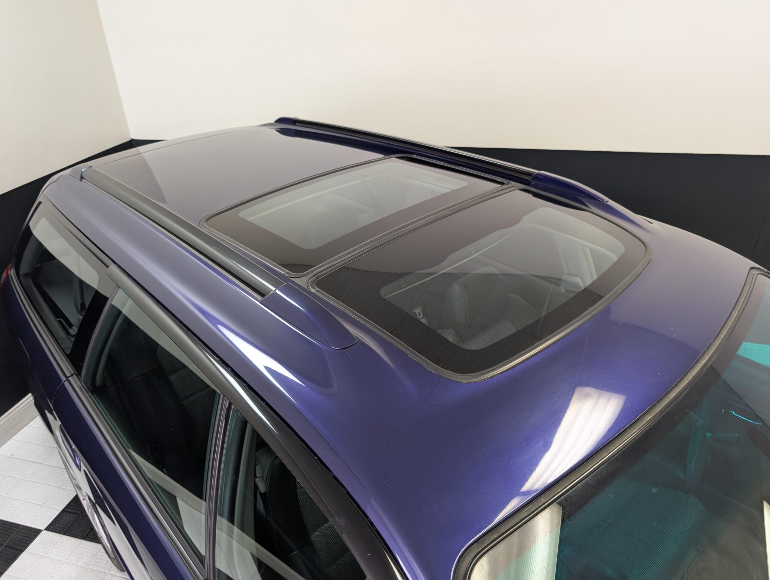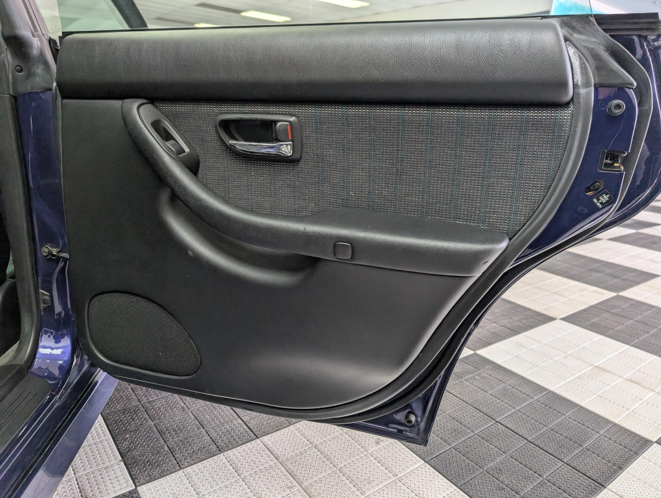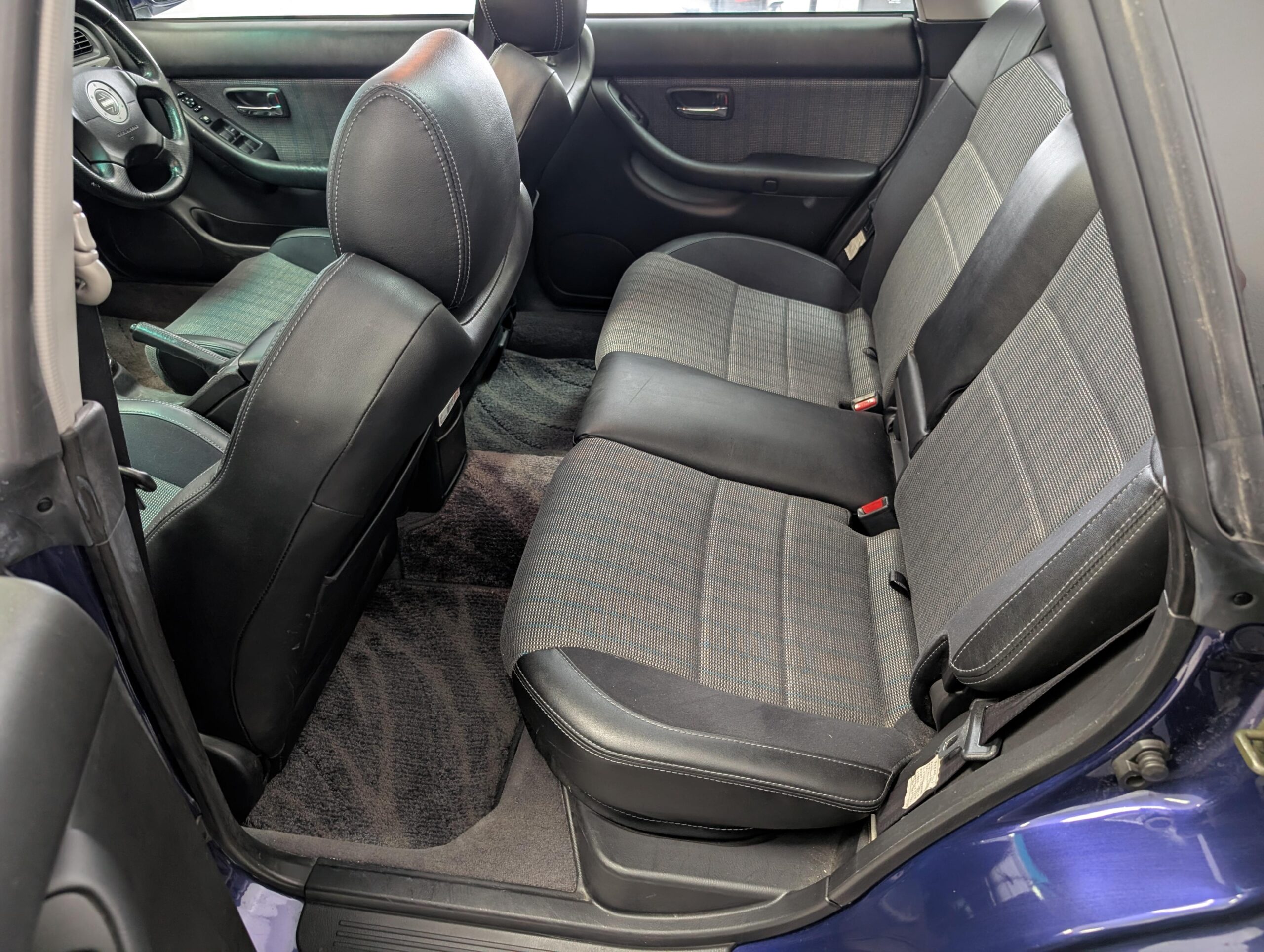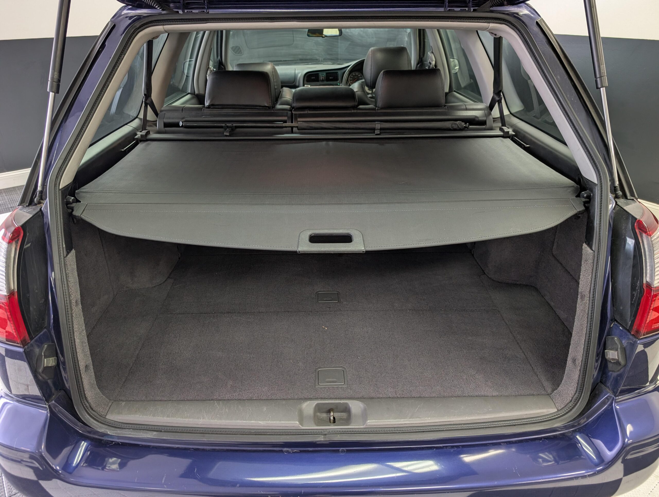This Legacy has a dark blue exterior and black leather/cloth interior, a stock 2.0L EJ20 twin turbo engine with 276hp and a 5-speed manual transmission with limited-slip diferential, electric folding mirrors, air conditioning, window visors, double sunroofs, and fog lamps. It has a Kenwood head unit, and retains all other factory equipment.