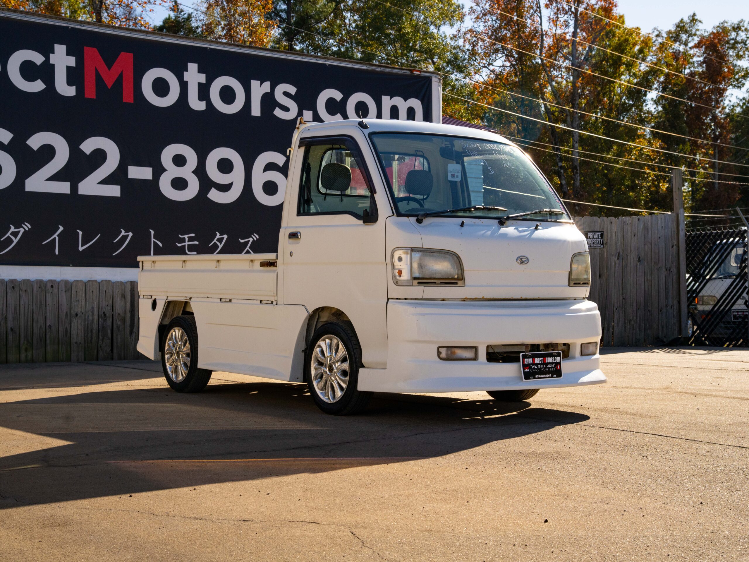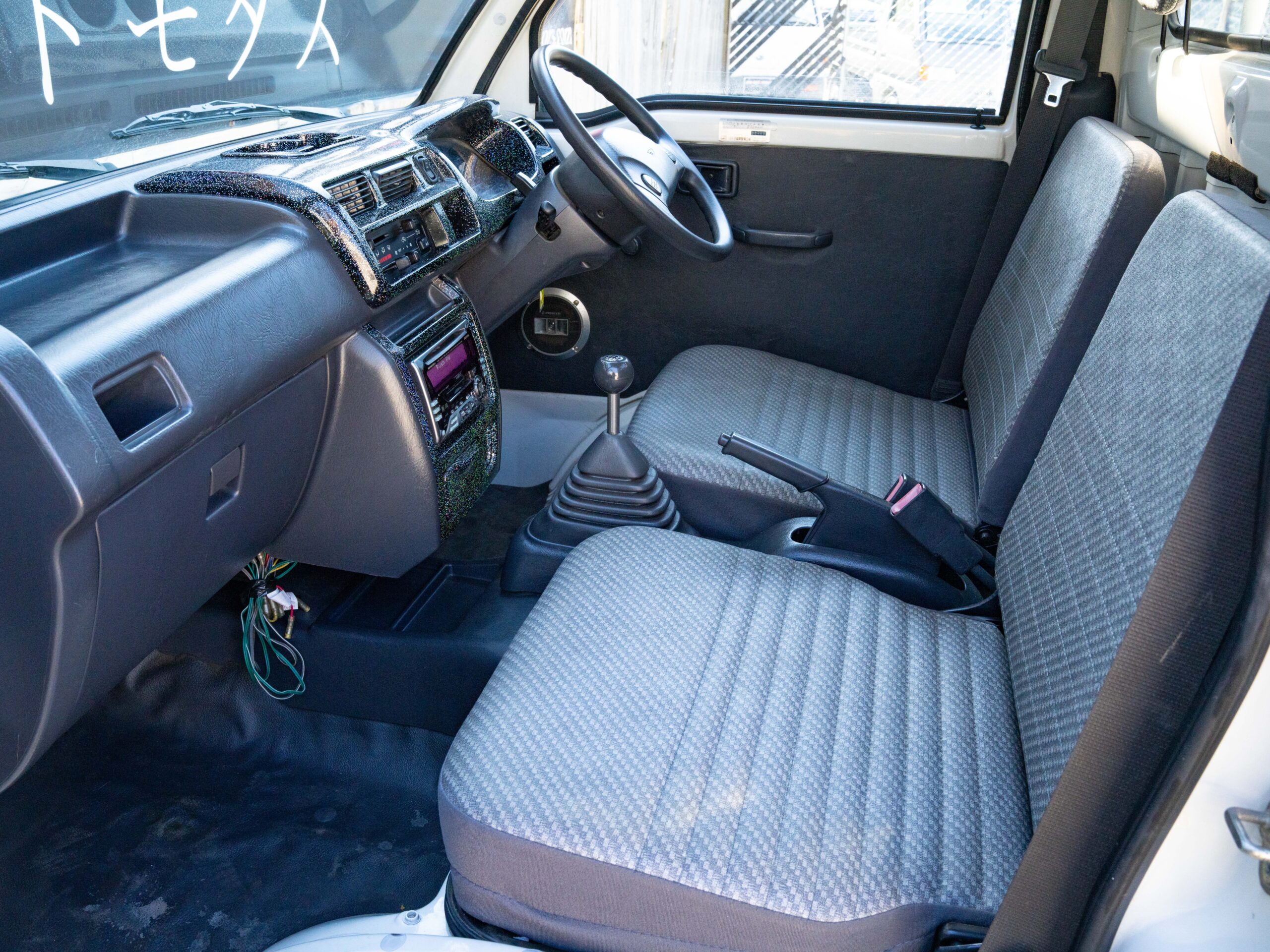 On the exterior, the white paint looks good and shines. Exterior imperfections include some slight scratches and imperfections consistent with a 25+ year old vehicle. There is some minor surface rust starting on the front of the truck around the windshield wipers. This truck has a Brostar JDM body kit giving it a very unique look that you cannot miss. Overall this Hijet is clean.