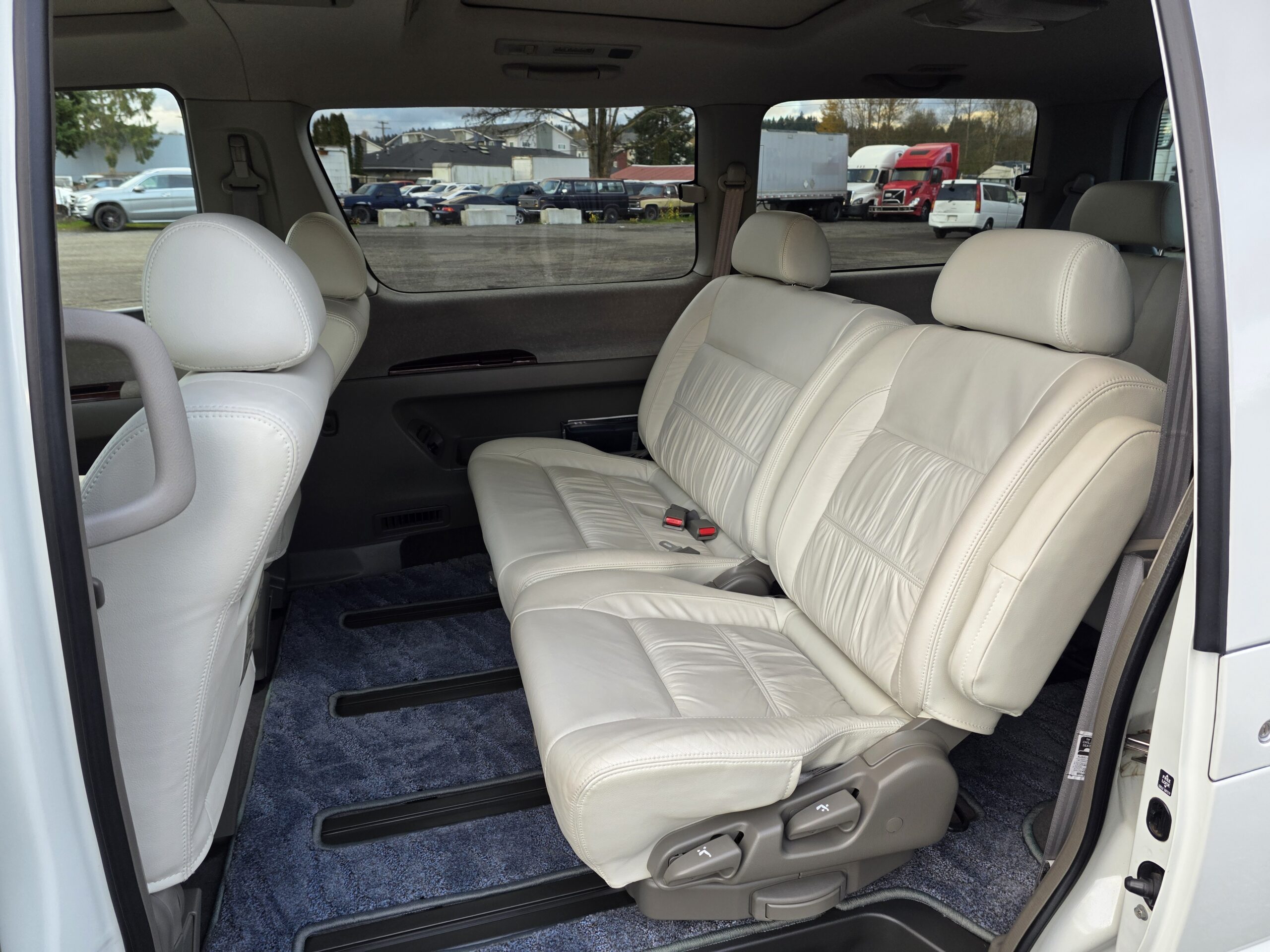 Finished in stunning White Mica / Pearl Tri-Coat over a rare white leather interior, this Rider Elgrand offers true VIP comfort with 8-passenger seating, lounge-style swivel chairs, and factory upgrades that set it apart from standard Elgrand models.